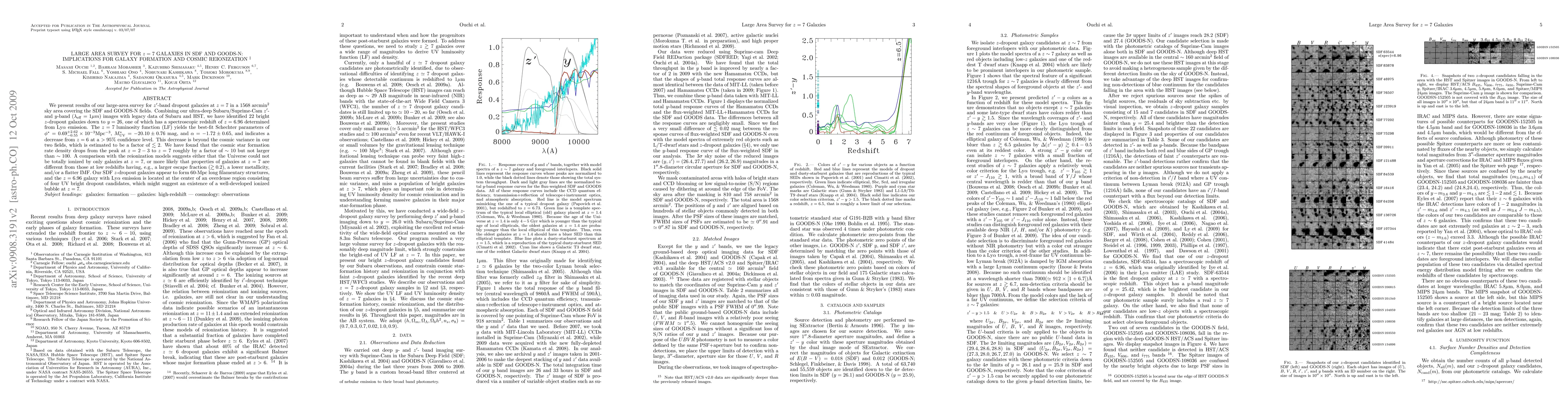 We present results of our large-area survey for z'-band dropout galaxies at z=7 in a 1568 arcmin^2 sky area covering the SDF and GOODS-N fields. Combining our ultra-deep Subaru/Suprime-Cam z'- and y-band (lambda_eff=1um) images with legacy data of Subaru and HST, we have identified 22 bright z-dropout galaxies down to y=26, one of which has a spectroscopic redshift of z=6.96 determined from Lya emission. The z=7 luminosity function (LF) yields the best-fit Schechter parameters of phi*=0.69 +2.62/-0.55 x10^(-3) Mpc^(-3), Muv*=-20.10 +/-0.76 mag, and alpha=-1.72 +/-0.65, and indicates a decrease from z=6 at a >95% confidence level. This decrease is beyond the cosmic variance in our two fields, which is estimated to be a factor of <~2. We have found that the cosmic star formation rate density drops from the peak at z=2-3 to z=7 roughly by a factor of ~10 but not larger than ~100. A comparison with the reionization models suggests either that the Universe could not be totally ionized by only galaxies at z=7, or more likely that properties of galaxies at z=7 are different from those at low redshifts having, e.g., a larger escape fraction (>~0.2), and/or a flatter IMF. Our SDF z-dropout galaxies appear to form 60-Mpc long filamentary structures, and the z=6.96 galaxy with Lya emission is located at the center of an overdense region consisting of four UV bright dropout candidates, which might suggest an existence of a well-developed ionized bubble at z=7.