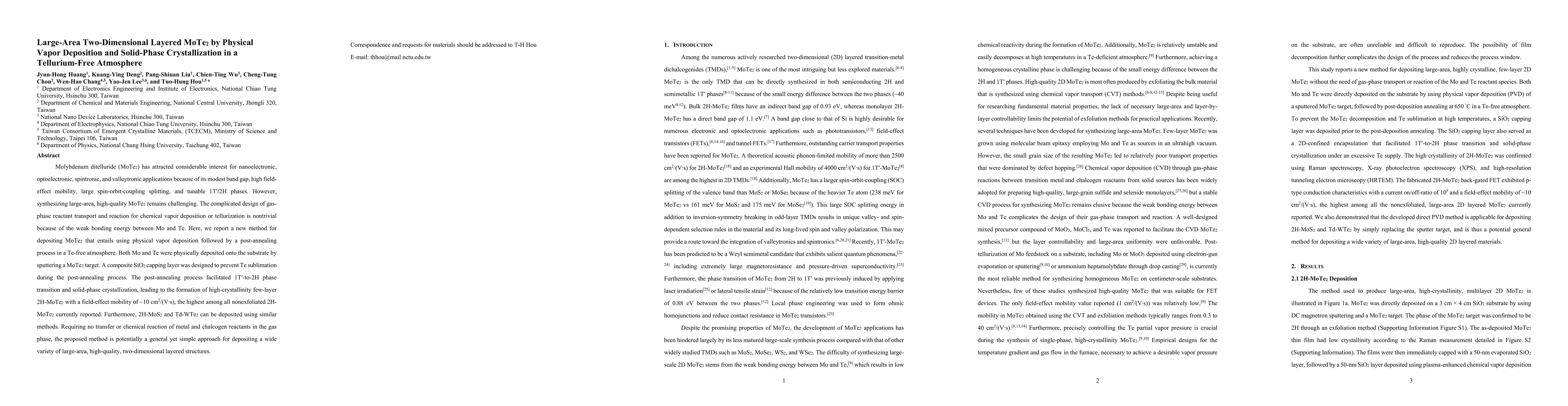Molybdenum ditelluride (MoTe$_2$) has attracted considerable interest for nanoelectronic, optoelectronic, spintronic, and valleytronic applications because of its modest band gap, high field-effect mobility, large spin-orbit-coupling splitting, and tunable 1T'/2H phases. However, synthesizing large-area, high-quality MoTe$_2$ remains challenging. The complicated design of gas-phase reactant transport and reaction for chemical vapor deposition or tellurization is nontrivial because of the weak bonding energy between Mo and Te. Here, we report a new method for depositing MoTe$_2$ that entails using physical vapor deposition followed by a post-annealing process in a Te-free atmosphere. Both Mo and Te were physically deposited onto the substrate by sputtering a MoTe$_2$ target. A composite SiO$_2$ capping layer was designed to prevent Te sublimation during the post-annealing process. The post-annealing process facilitated 1T'-to-2H phase transition and solid-phase crystallization, leading to the formation of high-crystallinity few-layer 2H-MoTe$_2$ with a field-effect mobility of ~10 cm$^2$/(V-s), the highest among all nonexfoliated 2H-MoTe$_2$ currently reported. Furthermore, 2H-MoS$_2$ and Td-WTe$_2$ can be deposited using similar methods. Requiring no transfer or chemical reaction of metal and chalcogen reactants in the gas phase, the proposed method is potentially a general yet simple approach for depositing a wide variety of large-area, high-quality, two-dimensional layered structures.