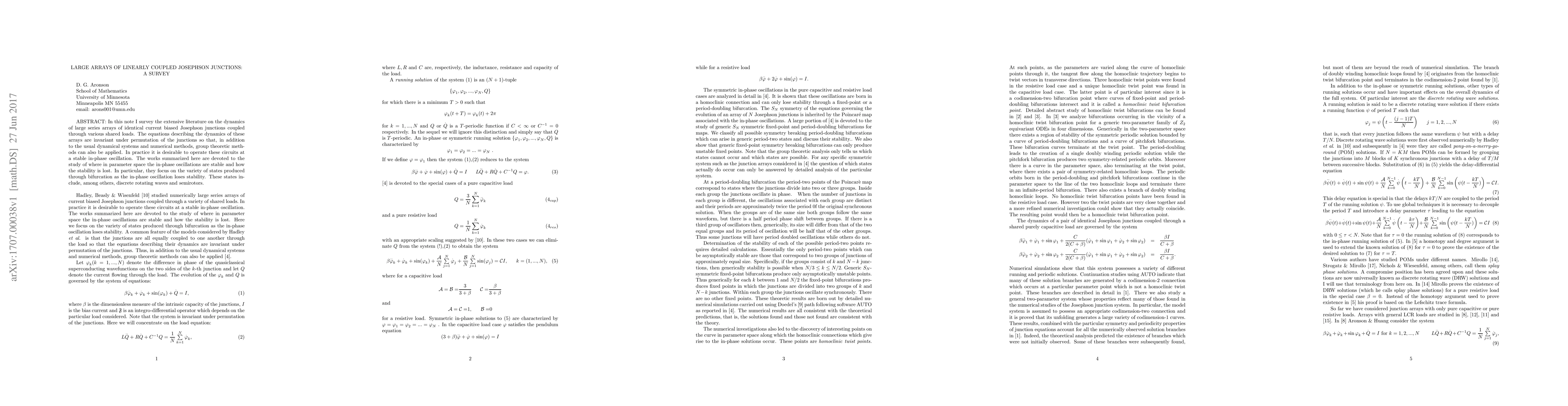 In this note I survey the extensive literature on the dynamics of large series arrays of identical current biased Josephson junctions coupled through various shared loads. The equations describing the dynamics are invariant under permutation of the junctions so that in addition to the usual dynamical systems and numerical methods, group theoretic methods can be applied. In practice it is desirable to operate these circuits at a stable in-phase oscillation. The works summarized here are devoted to the study of where in parameter space the in-phase oscillations are stable and how the stability is lost. In particular, they focus on the variety of states produced through bifurcation as the in-phase oscillation loses stability. These states include discrete rotating waves and semirotors.