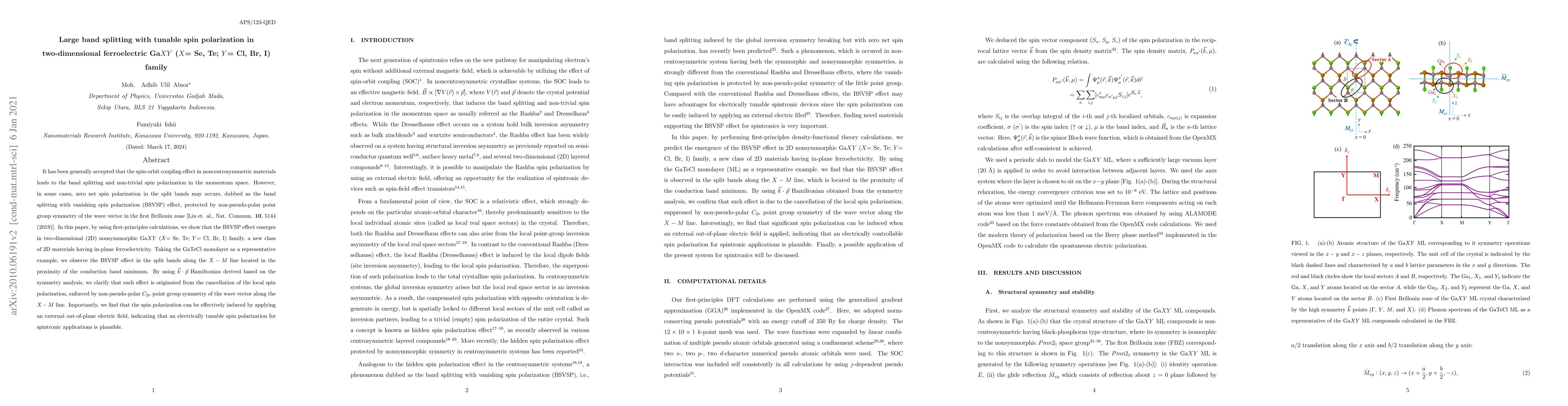 This paper demonstrates the emergence of band splitting with vanishing spin polarization (BSVSP) in 2D ferroelectric GaXY materials using first-principles calculations. The BSVSP effect, protected by non-pseudo-polar symmetry, can be tuned to induce spin polarization via an external electric field, suggesting potential for electrically tunable spintronic applications.
