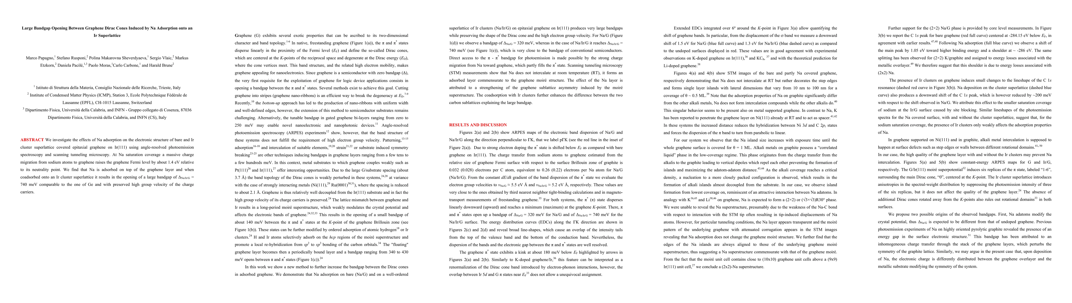 This paper investigates how sodium adsorption on an Ir superlattice affects the electronic structure of graphene, revealing a significant bandgap opening of 740 meV due to charge transfer from sodium to graphene, comparable to that in germanium. This modification maintains the high group velocity of charge carriers.