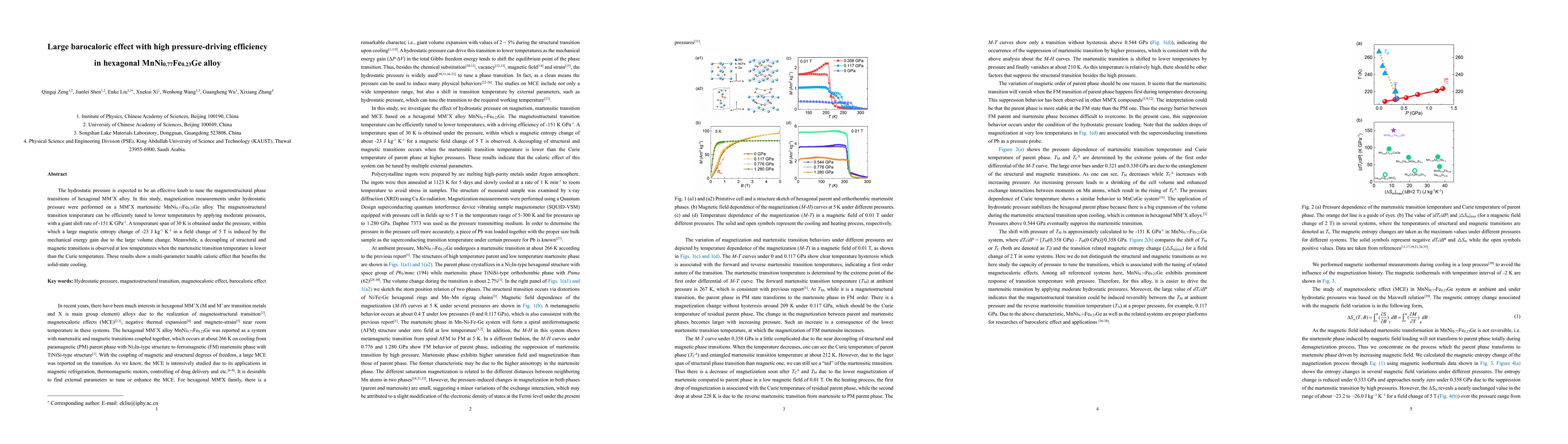This study investigates the barocaloric effect in hexagonal MnNi0.77Fe0.23Ge alloy, revealing a significant magnetostructural phase transition shift under hydrostatic pressure with a rate of -151 K GPa-1. The material exhibits a large magnetic entropy change of -23 J kg-1 K-1 under 5 T, demonstrating potential for solid-state cooling applications.