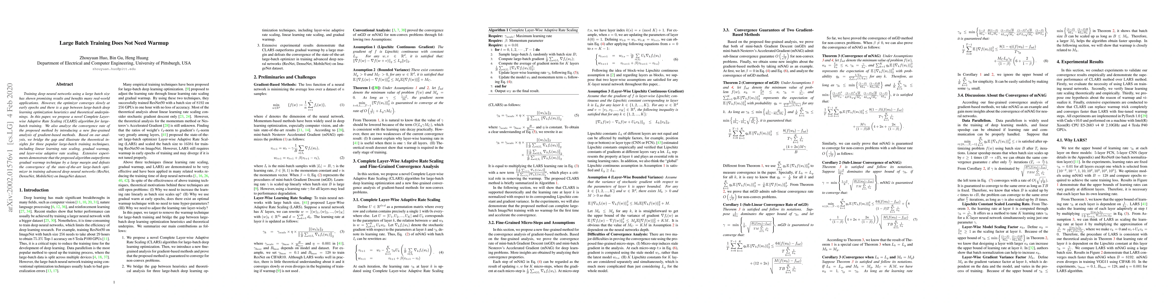 This paper proposes a Complete Layer-wise Adaptive Rate Scaling (CLARS) algorithm for large-batch training, demonstrating that it converges faster than traditional methods that rely on gradual warmup. The authors bridge the theoretical gap in large-batch optimization and show superior performance on ImageNet using ResNet, DenseNet, and MobileNet.
