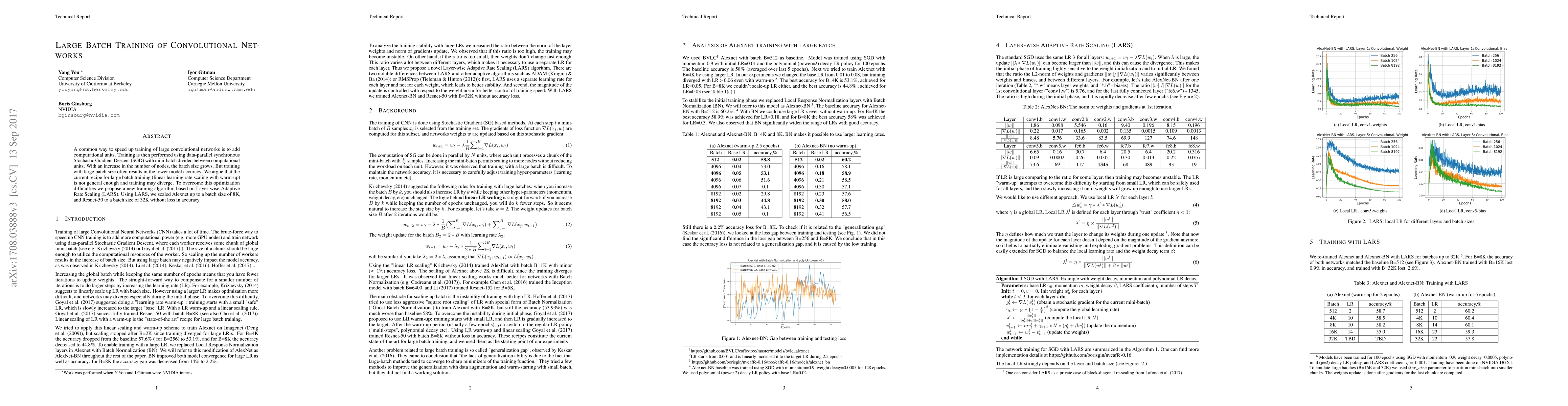 This paper proposes a new training algorithm called Layer-wise Adaptive Rate Scaling (LARS) to address the optimization difficulties of training large batch sizes in convolutional networks. The authors demonstrate that LARS enables scaling AlexNet to a batch size of 8K and ResNet-50 to 32K without loss in accuracy, overcoming the limitations of traditional large batch training methods.