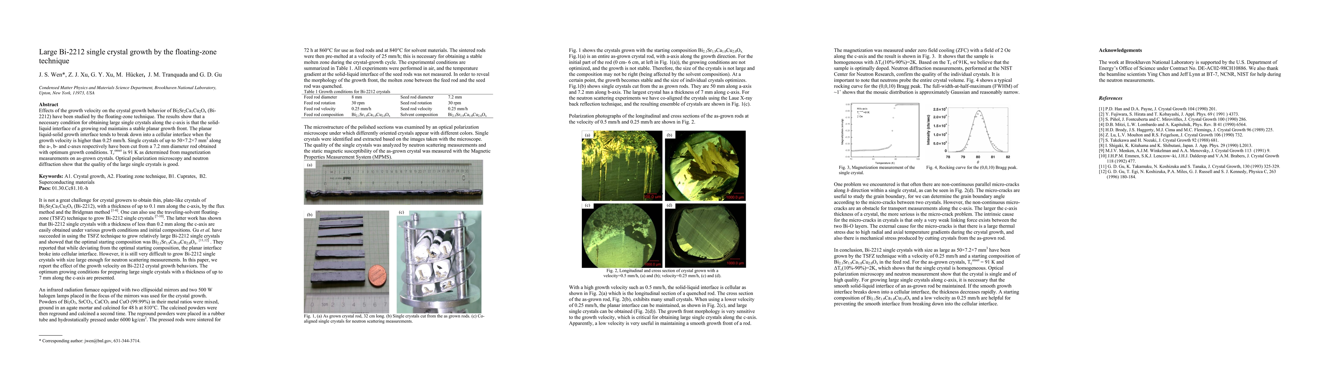 Effects of the growth velocity on the crystal growth behavior of Bi_2Sr_2Ca_1Cu_2O_x (Bi-2212) have been studied by floating zone technique. The results show that a necessary condition for obtaining large single crystals along the c-axis is that the solid-liquid interface of a growing rod maintains a stable planar growth front. The planar liquid-solid growth interface tends to break down into a cellular interface, while the growth velocity is higher than 0.25 mm/h. Single crystals of up to 50x7.2x7 mm3 along the a-, b- and caxes have been cut in a 7.2 mm diameter rod with optimum growth conditions. Tconset is 91 K measured by magnetic properties measurement system (MPMS) for as-grown crystals. Optical polarization microscope and neutron diffraction show that the quality of the single crystals is good.