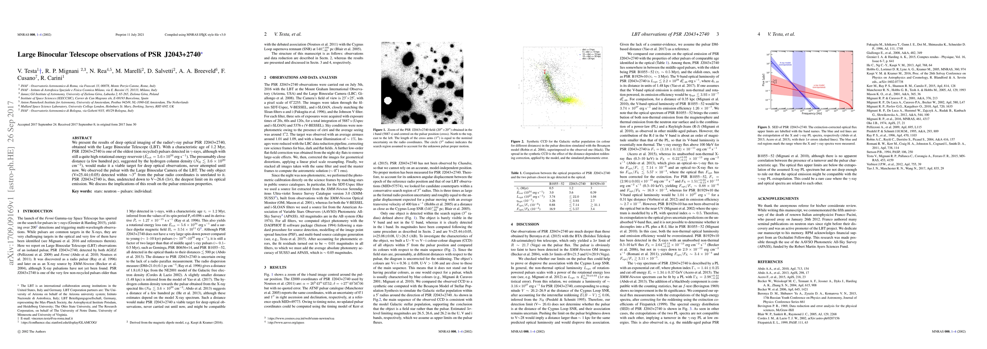 This study uses the Large Binocular Telescope to conduct deep optical imaging of the gamma-ray pulsar PSR J2043+2740, finding no optical counterpart within 3" of its radio coordinates, setting a deep optical detection limit of V~26.6 (3-σ). The result implies constraints on the pulsar's optical emission properties.