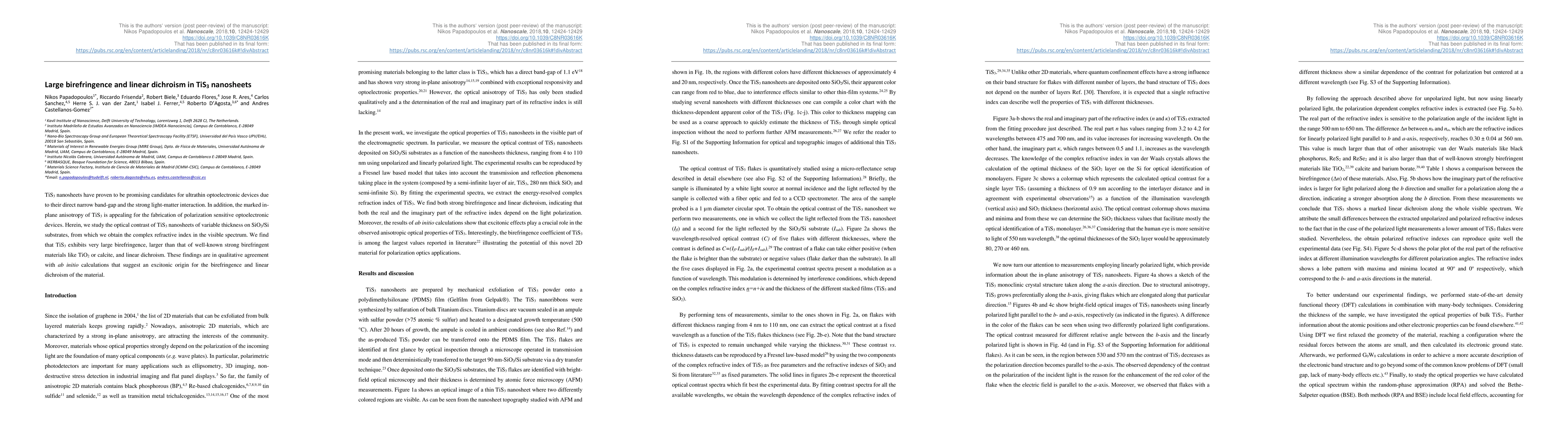 TiS3 nanosheets demonstrate exceptionally large birefringence and linear dichroism, surpassing materials like TiO2 and calcite, making them promising for polarization-sensitive optoelectronic devices. These optical properties are supported by ab initio calculations attributing them to excitonic effects.