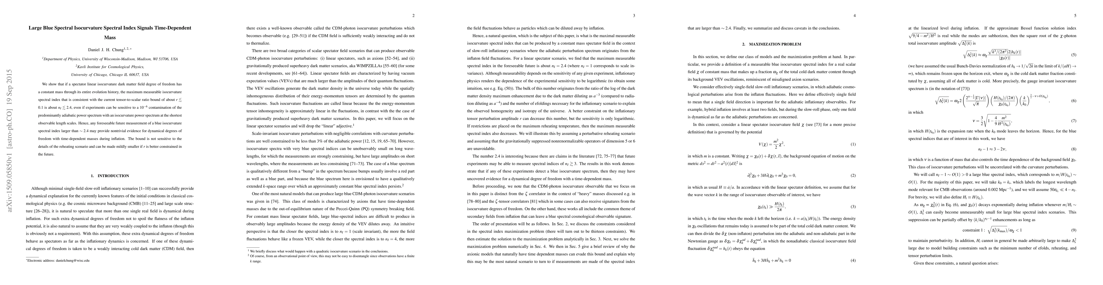 We show that if a spectator linear isocurvature dark matter field degree of freedom has a constant mass through its entire evolution history, the maximum measurable isocurvature spectral index that is consistent with the current tensor-to-scalar ratio bound is about 2.4, even if experiments can be sensitive to a $10^{-6}$ contamination of the predominantly adiabatic power spectrum with an isocurvature power spectrum at the shortest observable length scales. Hence, any foreseeable future measurement of a blue isocurvature spectral index larger than about 2.4 may provide nontrivial evidence for dynamical degrees of freedom with time-dependent masses during inflation. The bound is not sensitive to the details of the reheating scenario and can be made mildly smaller if the tensor-to-scalar ratio is better constrained in the future.