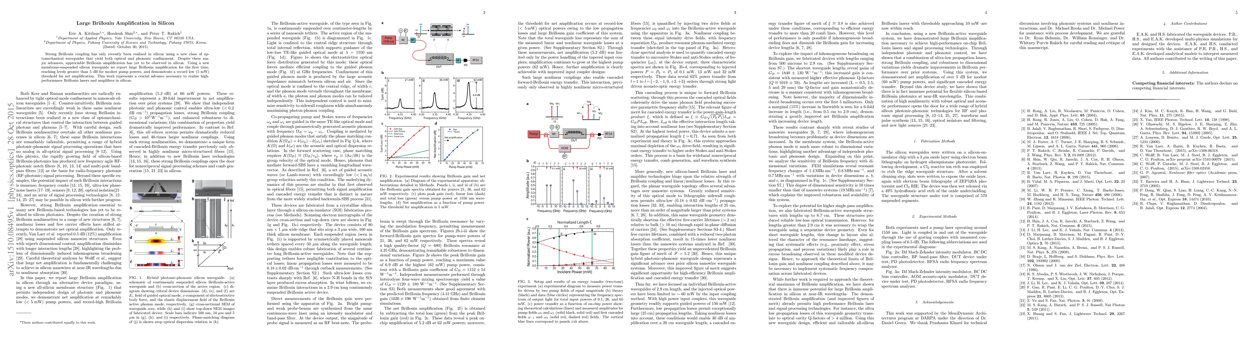 This paper reports the first observation of significant Brillouin amplification in silicon using membrane-suspended optomechanical waveguides, achieving over 5 dB gain at low pump powers, with a record low threshold of 5 mW, marking a significant step toward high-performance Brillouin lasers and amplifiers in silicon.