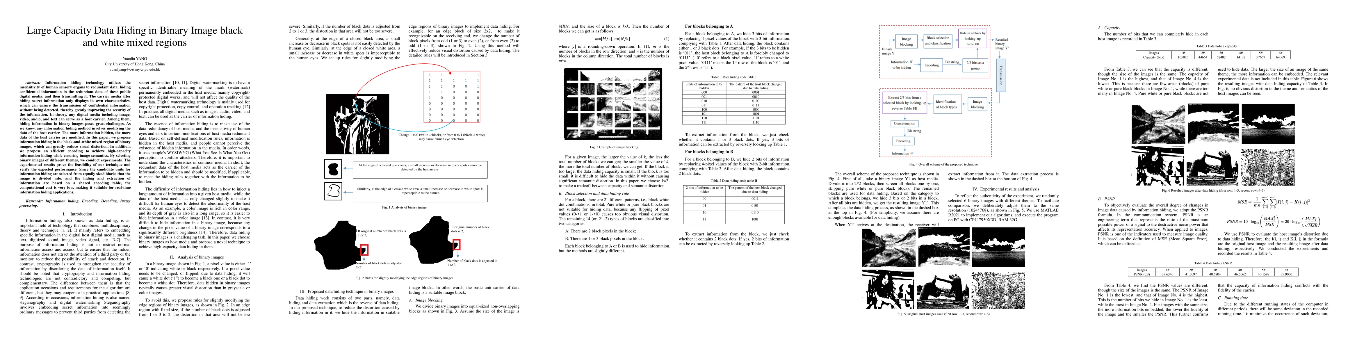 The paper proposes a data hiding technique in black-and-white mixed regions of binary images by dividing images into equal-sized blocks and selecting suitable blocks for hiding data, reducing visual distortion and ensuring image semantics.
