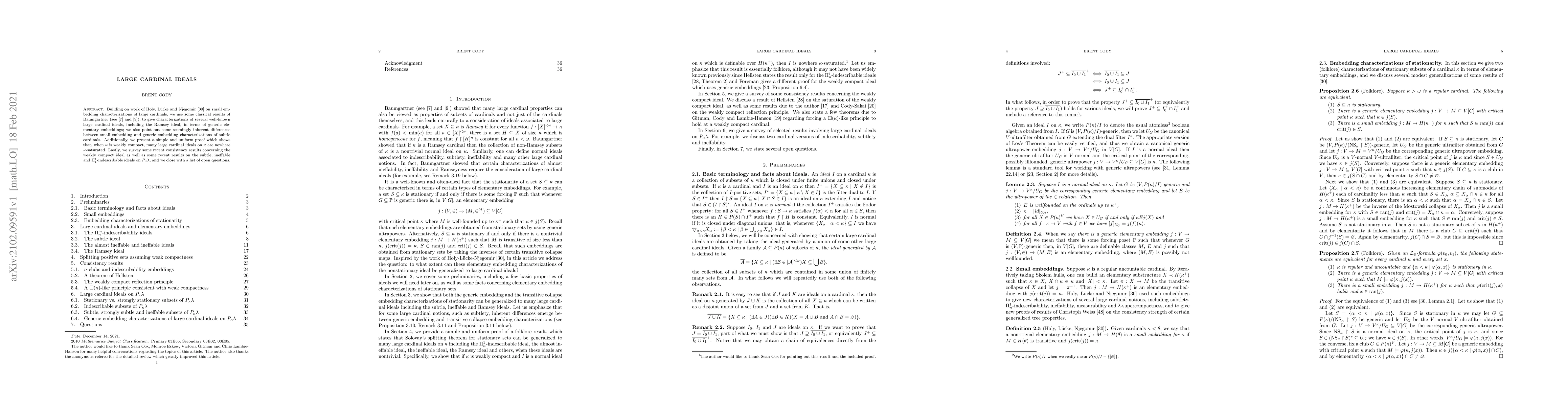 Building on work of Holy, L\"ucke and Njegomir \cite{MR3913154} on small embedding characterizations of large cardinals, we use some classical results of Baumgartner (see \cite{MR0384553} and \cite{MR0540770}), to give characterizations of several well-known large cardinal ideals, including the Ramsey ideal, in terms of generic elementary embeddings; we also point out some seemingly inherent differences between small embedding and generic embedding characterizations of subtle cardinals. Additionally, we present a simple and uniform proof which shows that, when $\kappa$ is weakly compact, many large cardinal ideals on $\kappa$ are nowhere $\kappa$-saturated. Lastly, we survey some recent consistency results concerning the weakly compact ideal as well as some recent results on the subtle, ineffable and $\Pi^1_1$-indescribable ideals on $P_\kappa\lambda$, and we close with a list of open questions.