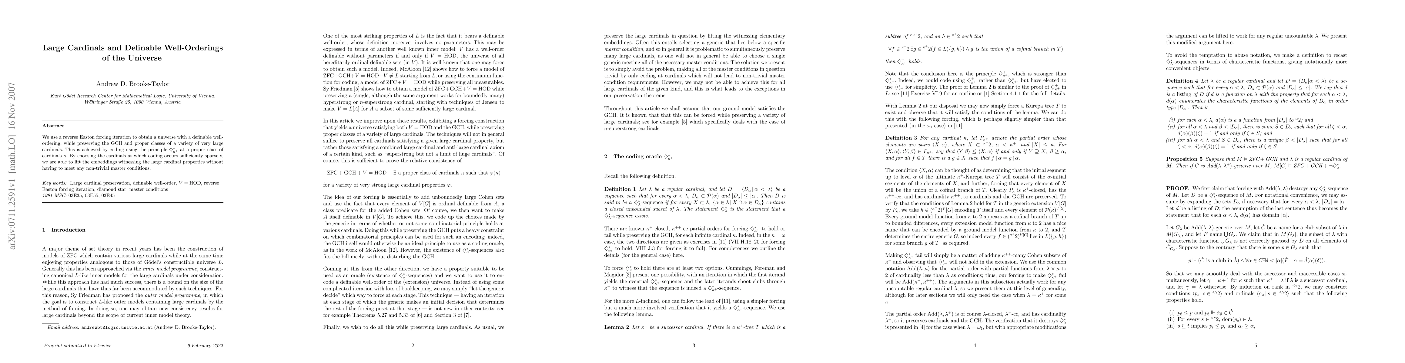 We use a reverse Easton forcing iteration to obtain a universe with a definable well-ordering, while preserving the GCH and proper classes of a variety of very large cardinals. This is achieved by coding using the principle diamond star at a proper class of successor cardinals.