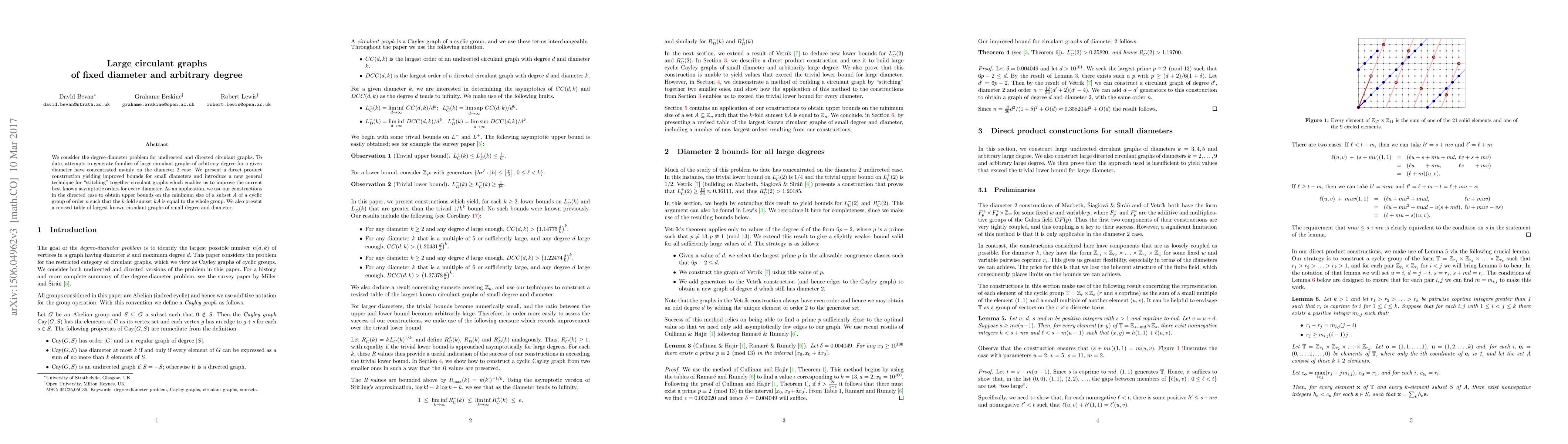 This paper presents a new construction technique to generate large circulant graphs of arbitrary degree and fixed diameter, improving upon current bounds for small diameters. It applies these methods to determine the minimum size of subsets in cyclic groups where their sumset equals the whole group.