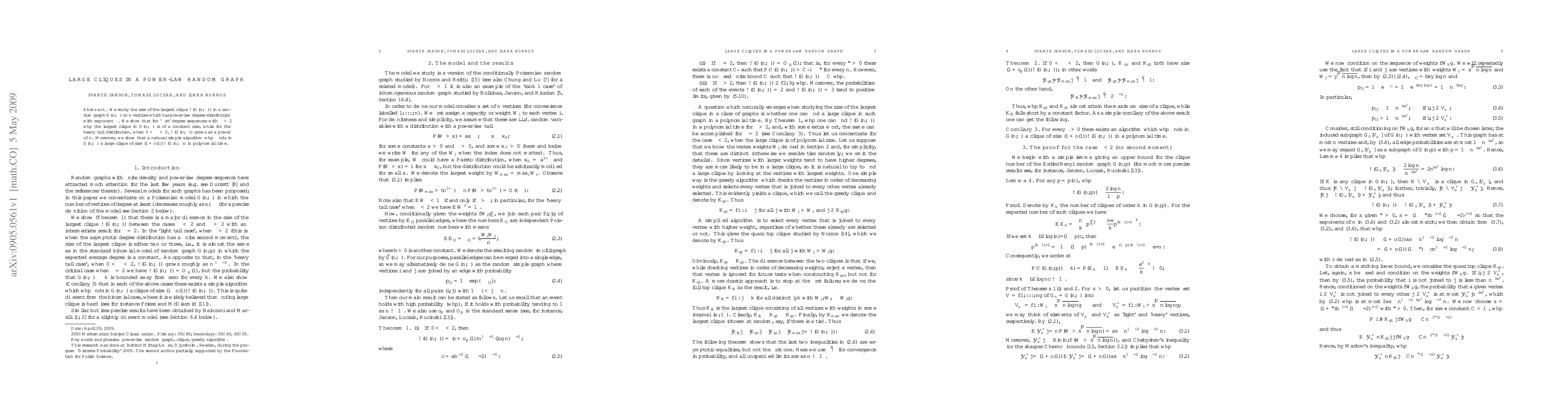 We study the size of the largest clique $\omega(G(n,\alpha))$ in a random graph $G(n,\alpha)$ on $n$ vertices which has power-law degree distribution with exponent $\alpha$. We show that for `flat' degree sequences with $\alpha>2$ whp the largest clique in $G(n,\alpha)$ is of a constant size, while for the heavy tail distribution, when $0<\alpha<2$, $\omega(G(n,\alpha))$ grows as a power of $n$. Moreover, we show that a natural simple algorithm whp finds in $G(n,\alpha)$ a large clique of size $(1+o(1))\omega(G(n,\alpha))$ in polynomial time.