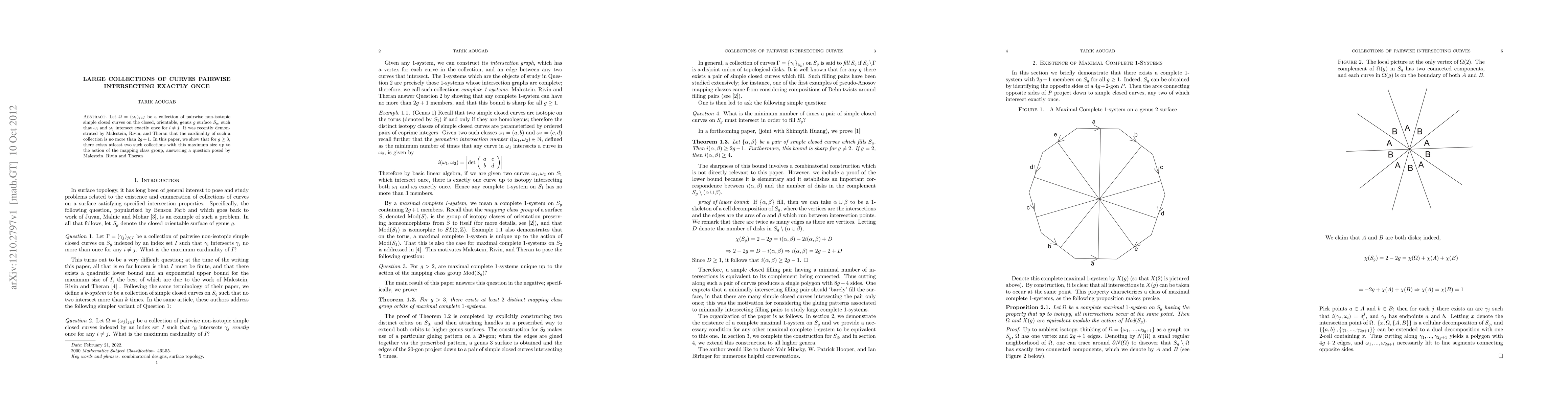 Let $\Omega=(\omega_{j})_{j\in I}$ be a collection of pairwise non-isotopic simple closed curves on the closed, orientable, genus $g$ surface $S_{g}$, such that $\omega_{i}$ and $\omega_{j}$ intersect exactly once for $i\neq j$. It was recently demonstrated by Malestein, Rivin, and Theran that the cardinality of such a collection is no more than $2g+1$. In this paper, we show that for $g\geq 3$, there exists at least two such collections with this maximum size up to the action of the mapping class group, answering a question posed by Malestein, Rivin and Theran.