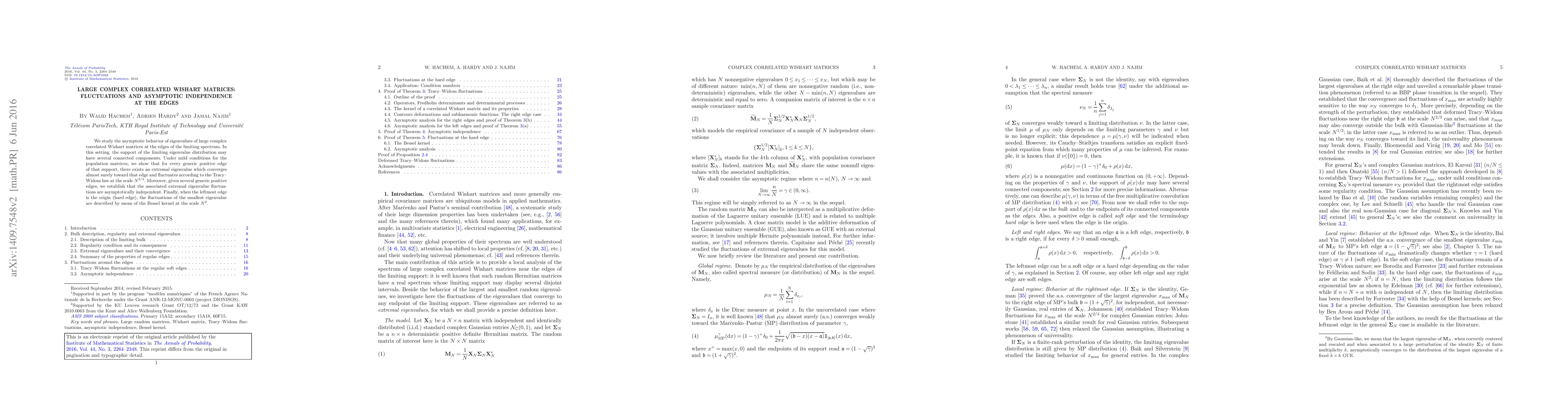 This paper investigates the asymptotic behavior of eigenvalues of large complex correlated Wishart matrices, focusing on fluctuations and edge independence. It shows that extremal eigenvalues converge to positive edges and fluctuate according to the Tracy-Widom law, while fluctuations at different edges become asymptotically independent. For hard edges, the smallest eigenvalue's fluctuations follow the Bessel kernel law.