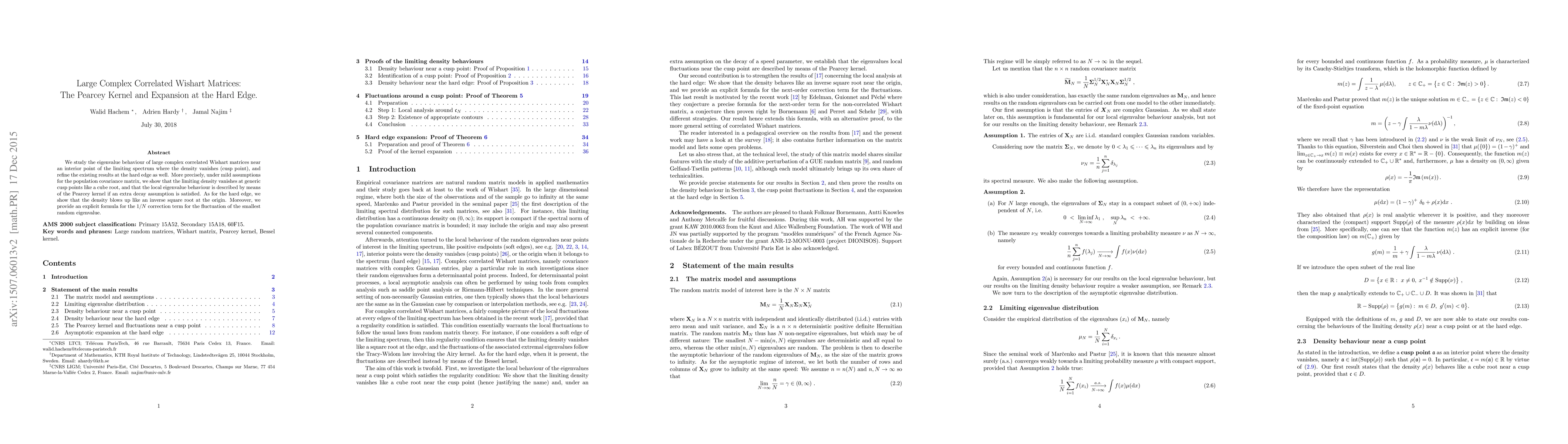 This paper investigates the eigenvalue behavior of large complex correlated Wishart matrices near the hard edge and cusp points of the limiting spectrum. It reveals that the density vanishes at cusp points like a cube root and is described by the Pearcey kernel under certain decay conditions, while the density blows up like an inverse square root at the hard edge. Additionally, it provides an explicit formula for the $1/N$ correction term for the smallest eigenvalue's fluctuation.