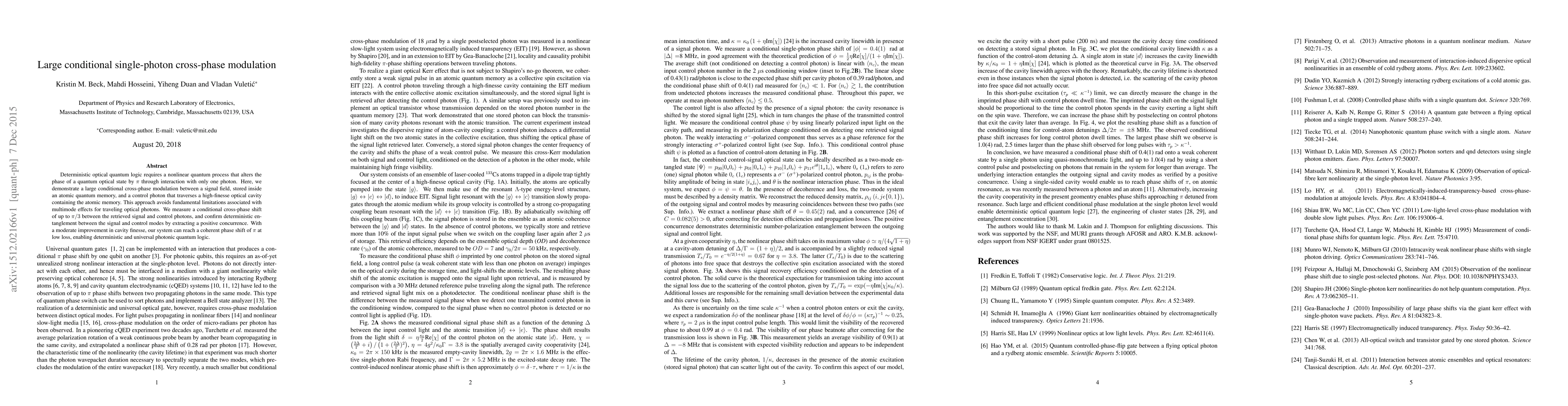 This paper demonstrates a large conditional cross-phase modulation between a signal field stored in an atomic quantum memory and a control photon, achieving a phase shift of up to $\pi/3$. This method enables deterministic entanglement and paves the way for universal photonic quantum logic with potential for a full $\pi$ phase shift with improved cavity finesse.