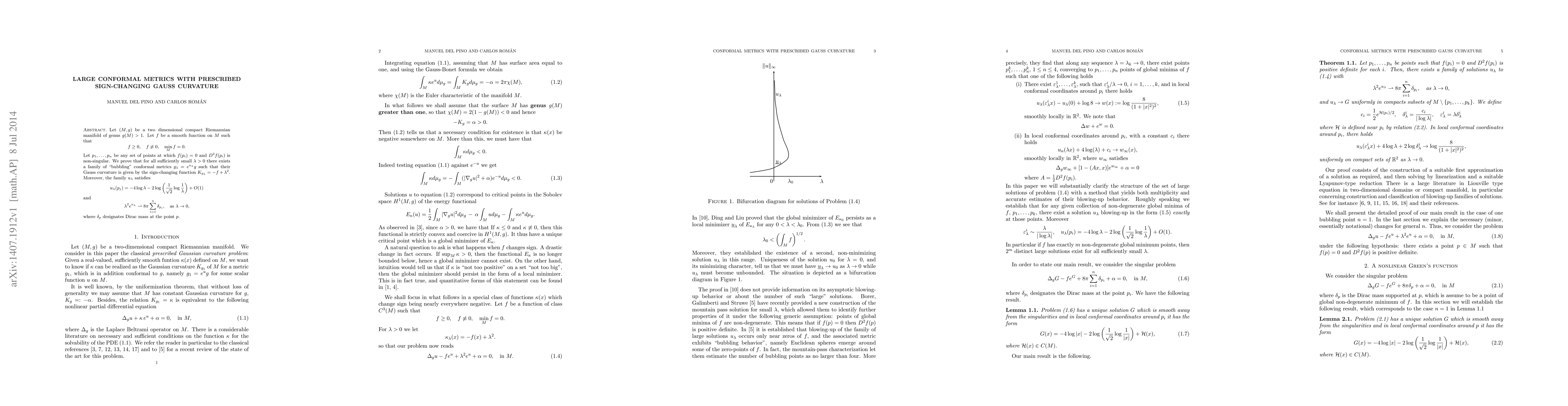 This paper proves the existence of large conformal metrics on a compact Riemannian surface with genus greater than one, where the Gauss curvature is a prescribed sign-changing function. The metrics exhibit "bubbling" behavior as a parameter approaches zero, with the conformal factor converging to a sum of Dirac masses at specified zero points of the function.