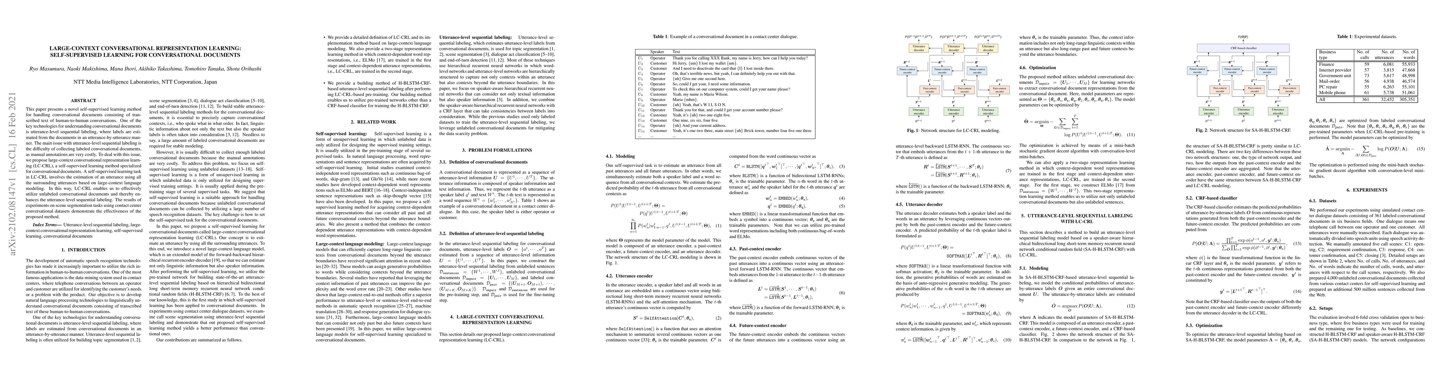 This paper introduces LC-CRL, a self-supervised learning method for large-context conversational representation learning, addressing the challenge of costly labeled data in conversational documents. The method effectively utilizes unlabeled data to improve utterance-level sequential labeling, as demonstrated by successful scene segmentation in contact center datasets.