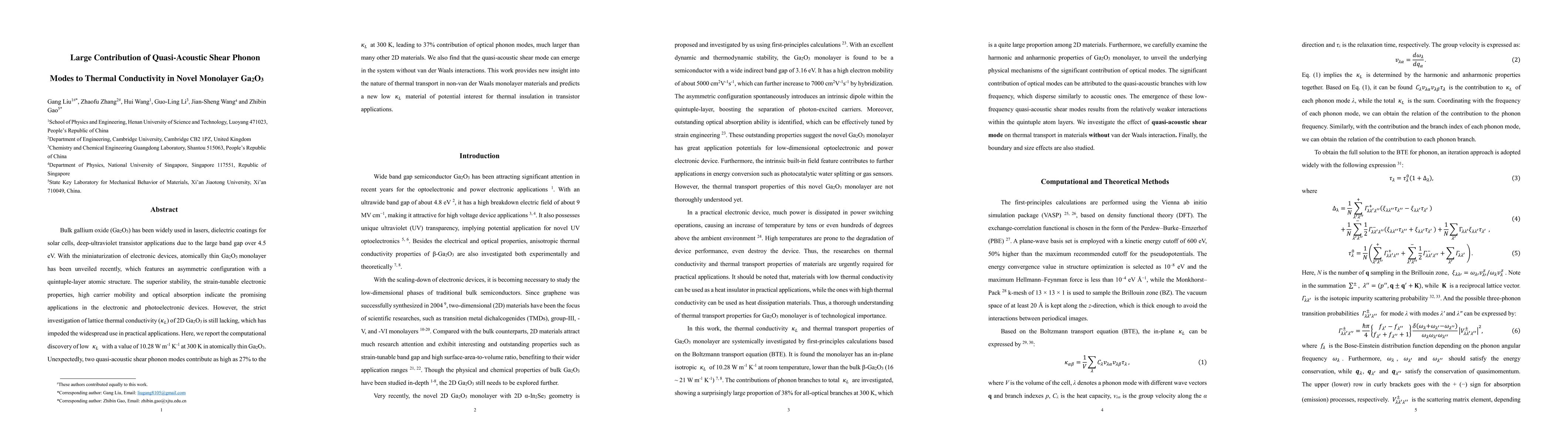 Bulk gallium oxide (Ga2O3) has been widely used in lasers, dielectric coatings for solar cells, deep-ultraviolet transistor applications due to the large band gap over 4.5 eV. With the miniaturization of electronic devices, atomically thin Ga2O3 monolayer has been unveiled recently, which features an asymmetric configuration with a quintuple-layer atomic structure. The superior stability, the strain-tunable electronic properties, high carrier mobility and optical absorption indicate the promising applications in the electronic and photoelectronic devices. However, the strict investigation of lattice thermal conductivity (kappa_L) of 2D Ga2O3 is still lacking, which has impeded the widespread use in practical applications. Here, we report the computational discovery of low kappa_L with a value of 10.28 W m-1 K-1 at 300 K in atomically thin Ga2O3. Unexpectedly, two quasi-acoustic shear phonon modes contribute as high as 27% to the kappa_L at 300 K, leading to 37% contribution of optical phonon modes, much larger than many other 2D materials. We also find that the quasi-acoustic shear mode can emerge in the system without van der Waals interactions. This work provides new insight into the nature of thermal transport in non-van der Waals monolayer materials and predicts a new low kappa_L material of potential interest for thermal insulation in transistor applications.