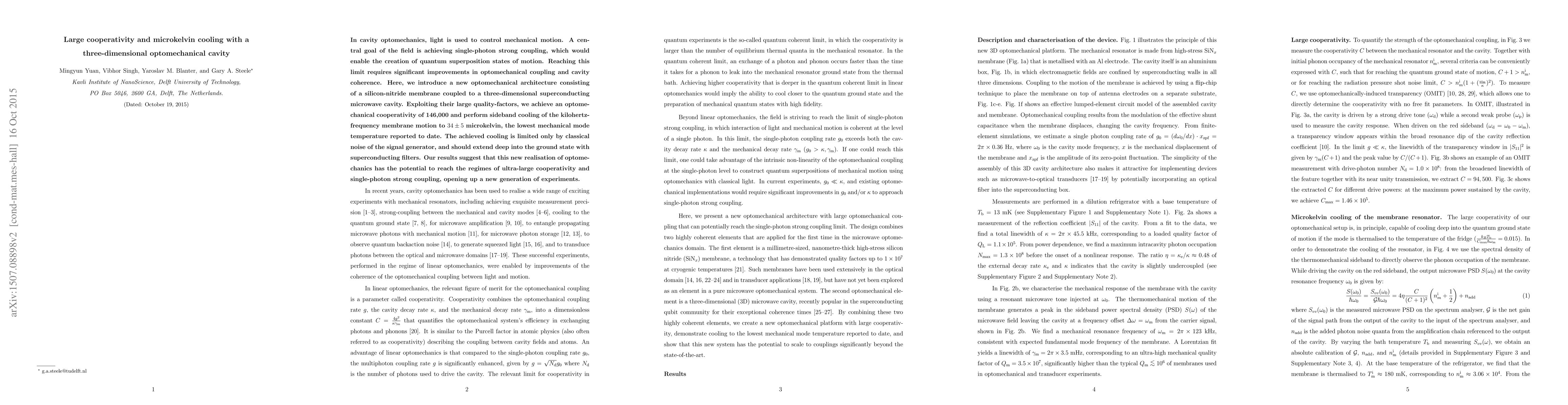 This paper reports the development of a three-dimensional optomechanical cavity using a silicon nitride membrane and a superconducting microwave cavity, achieving an unprecedented optomechanical cooperativity of 146,000 and cooling the membrane to 34±5 μK, the lowest mechanical mode temperature to date. The study suggests potential for reaching ultra-large cooperativity and single-photon strong coupling.