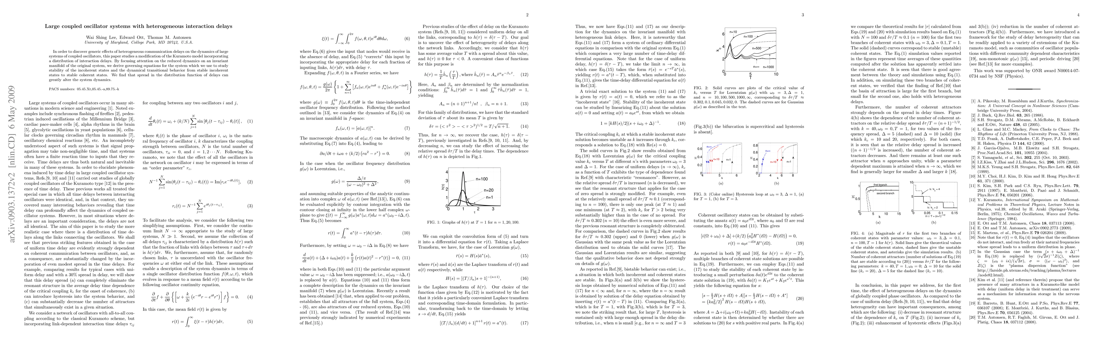 In order to discover generic effects of heterogeneous communication delays on the dynamics of large systems of coupled oscillators, this paper studies a modification of the Kuramoto model incorporating a distribution of interaction delays. By focusing attention on the reduced dynamics on an invariant manifold of the original system, we derive governing equations for the system which we use to study stability of the incoherent states and the dynamical transitional behavior from stable incoherent states to stable coherent states. We find that spread in the distribution function of delays can greatly alter the system dynamics.