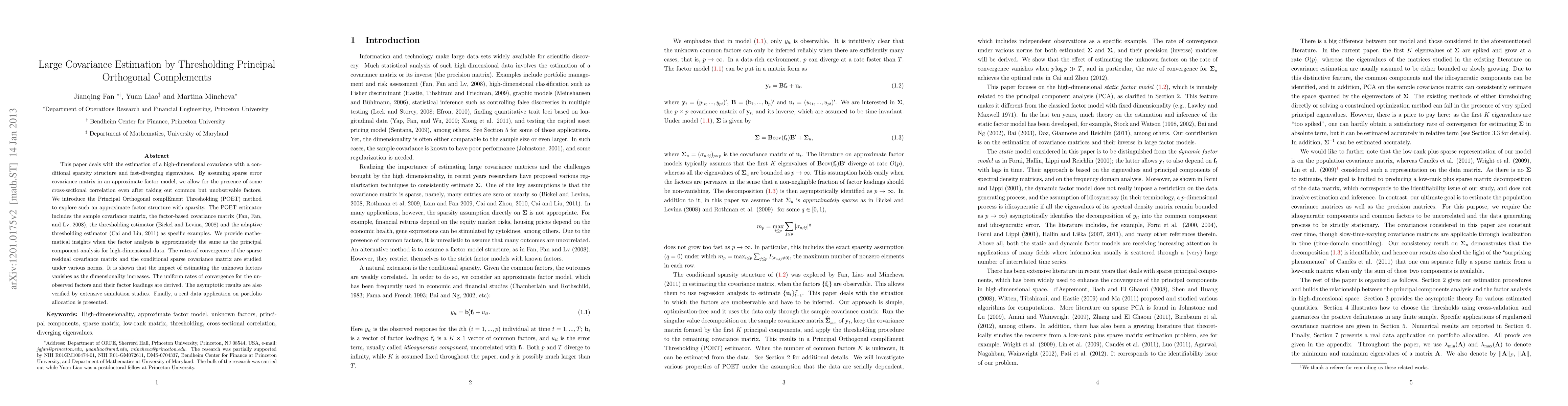 This paper introduces the POET method for estimating high-dimensional covariance matrices with conditional sparsity and fast-diverging eigenvalues, demonstrating its effectiveness through theoretical convergence rates and simulation studies, and applying it to portfolio allocation. The POET estimator integrates various existing methods and shows diminishing impact from estimating unknown factors as dimensionality increases.