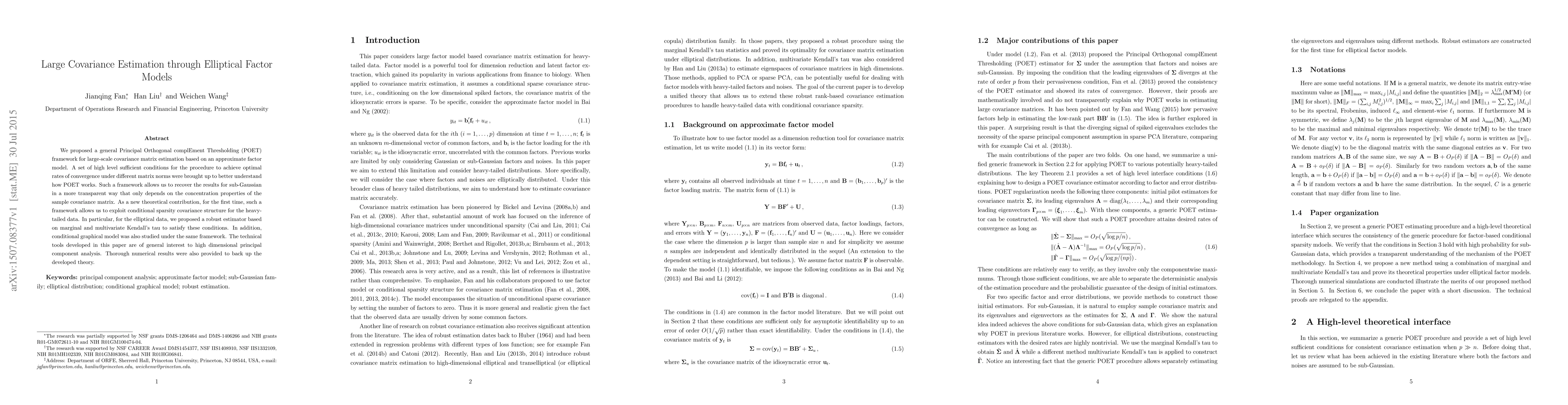 This paper introduces a POET framework for large-scale covariance estimation using elliptical factor models, providing optimal convergence conditions and a robust estimator for heavy-tailed data. Numerical results support the theoretical findings, with implications for high-dimensional principal component analysis.