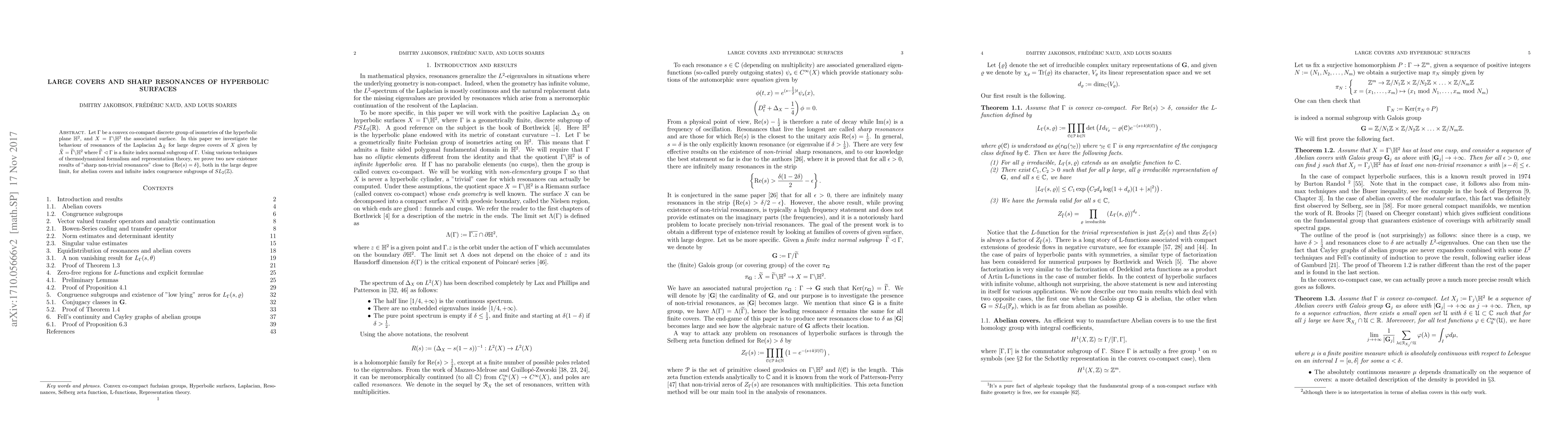 This paper explores the behavior of resonances of the Laplacian in large degree covers of hyperbolic surfaces associated with convex co-compact discrete groups. Utilizing thermodynamical formalism and representation theory, it proves the existence of 'sharp non-trivial resonances' near Re(s) = δ_Γ for both abelian covers and infinite index congruence subgroups of SL2(ℤ).
