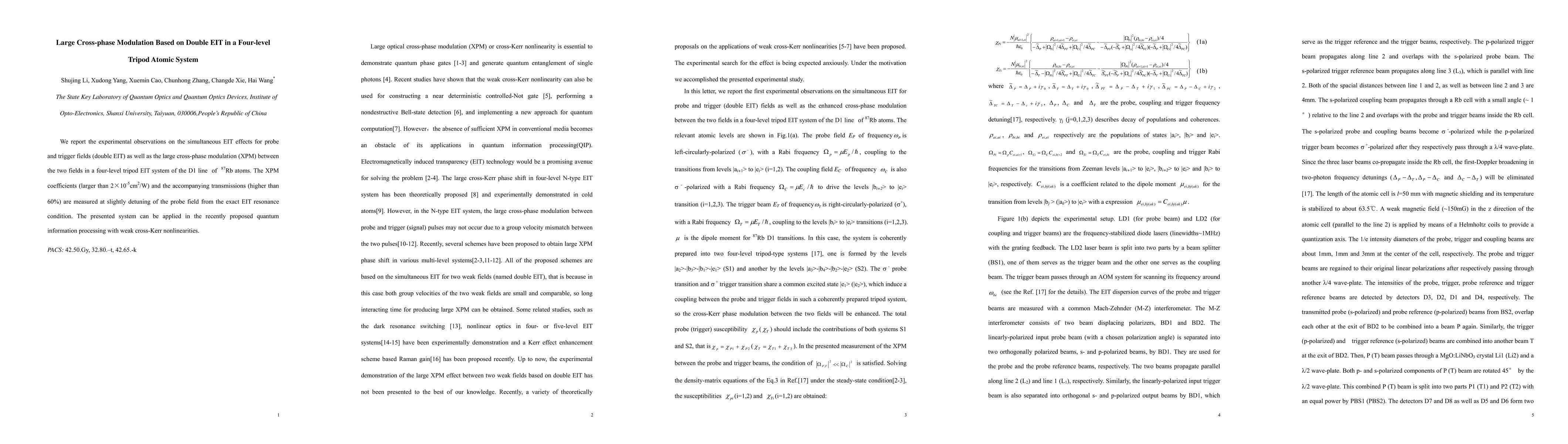 This paper reports on the experimental observation of large cross-phase modulation (XPM) in a four-level tripod atomic system using double electromagnetically induced transparency (EIT). The study measures significant XPM coefficients and high transmission rates, suggesting potential applications in quantum information processing.