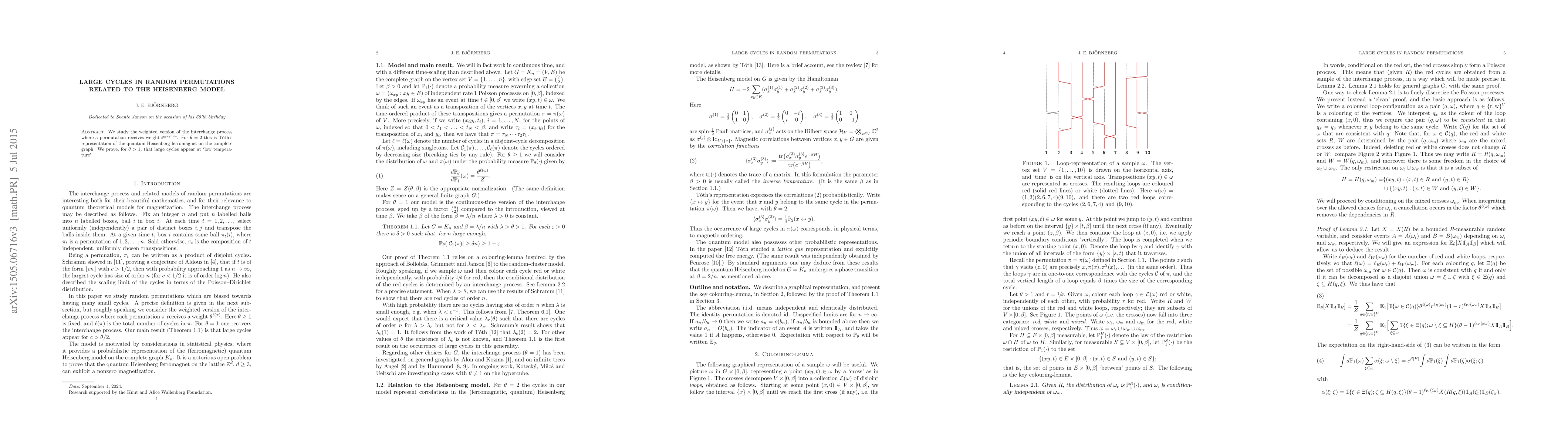Summary: This paper investigates the interchange process in permutations, assigning weight $\theta^{\#\mathrm{cycles}}$, and demonstrates that large cycles emerge at low temperatures for $\theta > 1$, analogous to T\'oth's representation of the quantum Heisenberg ferromagnet.