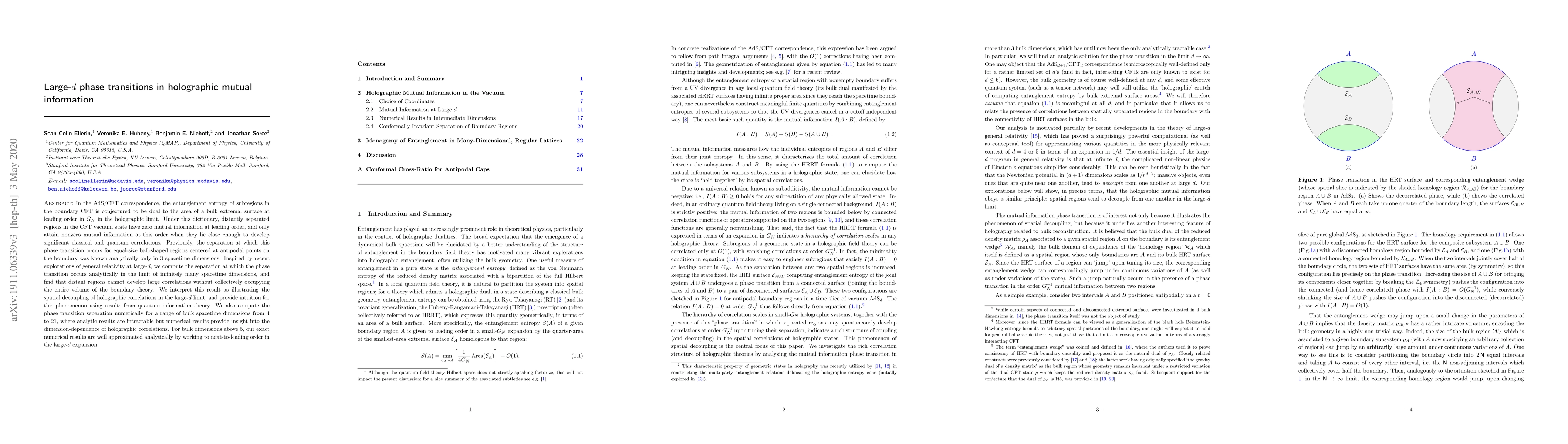 In the AdS/CFT correspondence, the entanglement entropy of subregions in the boundary CFT is conjectured to be dual to the area of a bulk extremal surface at leading order in $G_N$ in the holographic limit. Under this dictionary, distantly separated regions in the CFT vacuum state have zero mutual information at leading order, and only attain nonzero mutual information at this order when they lie close enough to develop significant classical and quantum correlations. Previously, the separation at which this phase transition occurs for equal-size ball-shaped regions centered at antipodal points on the boundary was known analytically only in $3$ spacetime dimensions. Inspired by recent explorations of general relativity at large-$d$, we compute the separation at which the phase transition occurs analytically in the limit of infinitely many spacetime dimensions, and find that distant regions cannot develop large correlations without collectively occupying the entire volume of the boundary theory. We interpret this result as illustrating the spatial decoupling of holographic correlations in the large-$d$ limit, and provide intuition for this phenomenon using results from quantum information literature. We also compute the phase transition separation numerically for a range of bulk spacetime dimensions from $4$ to $21$, where analytic results are intractable but numerical results provide insight into the dimension-dependence of holographic correlations. For bulk dimensions above $5$, our exact numerical results are well approximated analytically by working to next-to-leading order in the large-$d$ expansion.