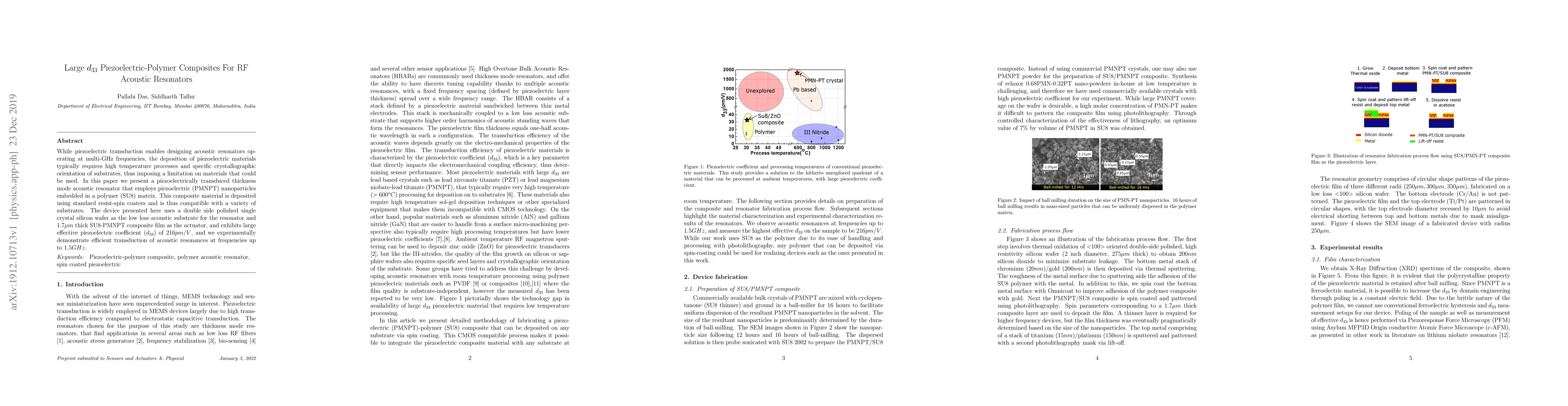 While piezoelectric transduction enables designing acoustic resonators operating at multi-GHz frequencies, the deposition of piezoelectric materials typically requires high temperature processes and specific crystallographic orientation of substrates, thus imposing a limitation on materials that could be used. In this paper we present a piezoelectrically transduced thickness mode acoustic resonator that employs piezoelectric (PMNPT) nanoparticles embedded in a polymer (SU8) matrix. This composite material is deposited using standard resist-spin coaters and is thus compatible with a variety of substrates. The device presented here uses a double side polished single crystal silicon wafer as the low loss acoustic substrate for the resonator and $1.7\mu m$ thick SU8-PMNPT composite film as the actuator, and exhibits large effective piezoelectric coefficient $(d_{33})$ of $216pm/V$, and we experimentally demonstrate efficient transduction of acoustic resonances at frequencies up to $1.5GHz$.