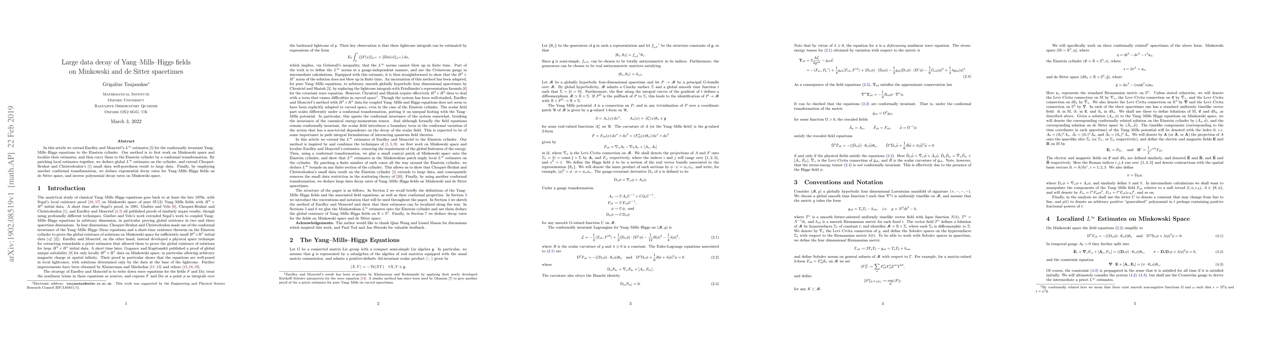 We extend Eardley and Moncrief's $L^\infty$ estimates for the conformally invariant Yang-Mills-Higgs equations to the Einstein cylinder. Our method is to first work on Minkowski space and localise their estimates, and then carry them to the Einstein cylinder by a conformal transformation. By patching local estimates together, we deduce global $L^\infty$ estimates on the cylinder, and extend Choquet-Bruhat and Christodoulou's small data well-posedness result to large data. Finally, by employing another conformal transformation, we deduce exponential decay rates for Yang-Mills-Higgs fields on de Sitter space, and inverse polynomial decay rates on Minkowski space.