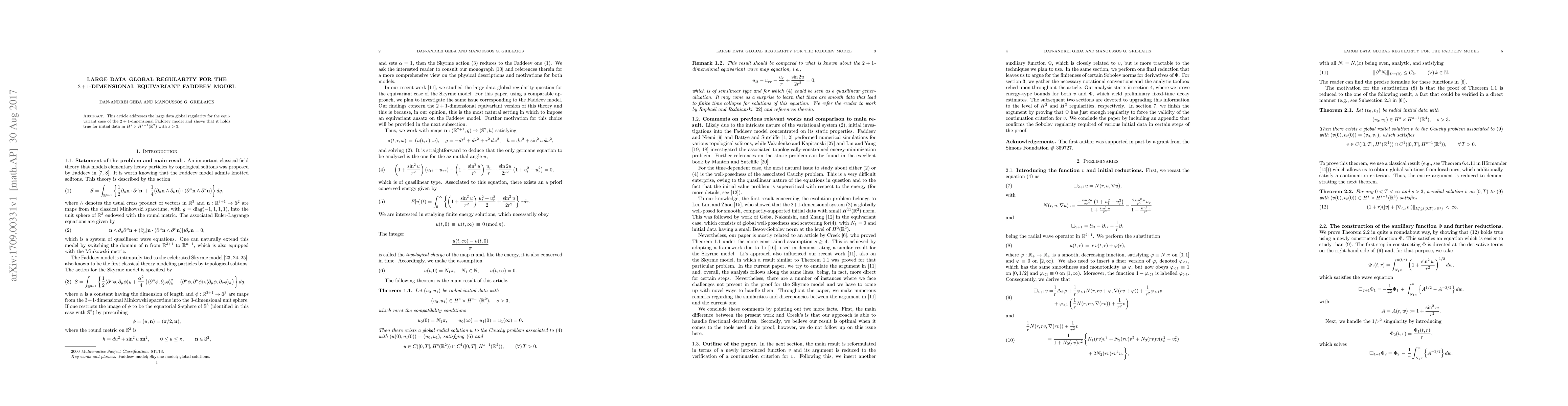 This paper proves the large data global regularity for the equivariant $2+1$-dimensional Faddeev model, demonstrating that the solution exists globally for initial data in $H^s\times H^{s-1}(\mathbb{R}^2)$ when $s > 3$.