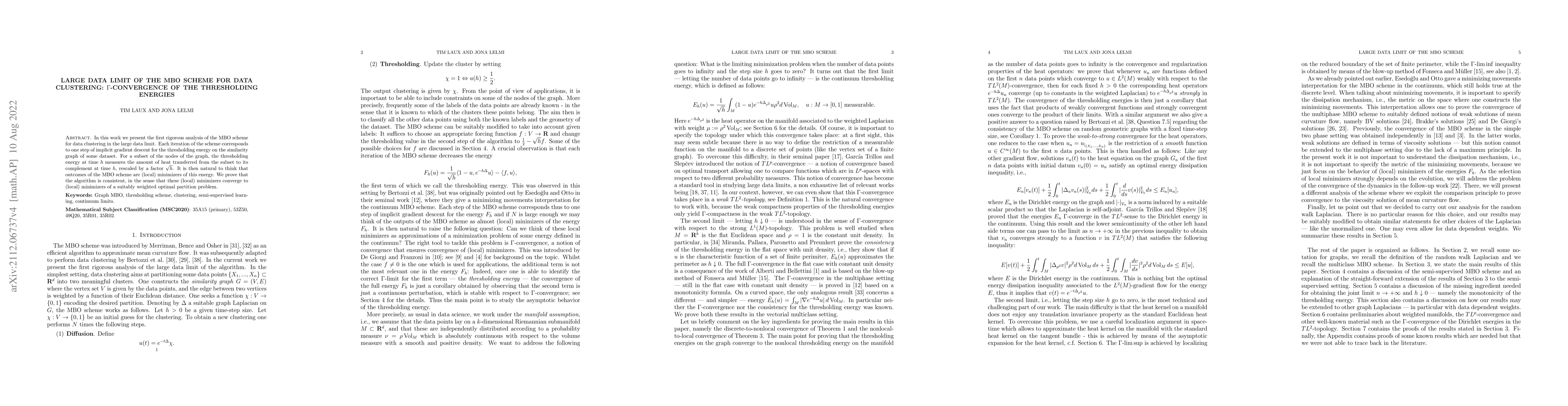 This paper rigorously analyzes the MBO scheme for data clustering in large datasets, showing that its iterations correspond to gradient descent steps for a thresholding energy. It proves the consistency of the algorithm, demonstrating that its local minimizers converge to minimizers of an optimal partition problem.