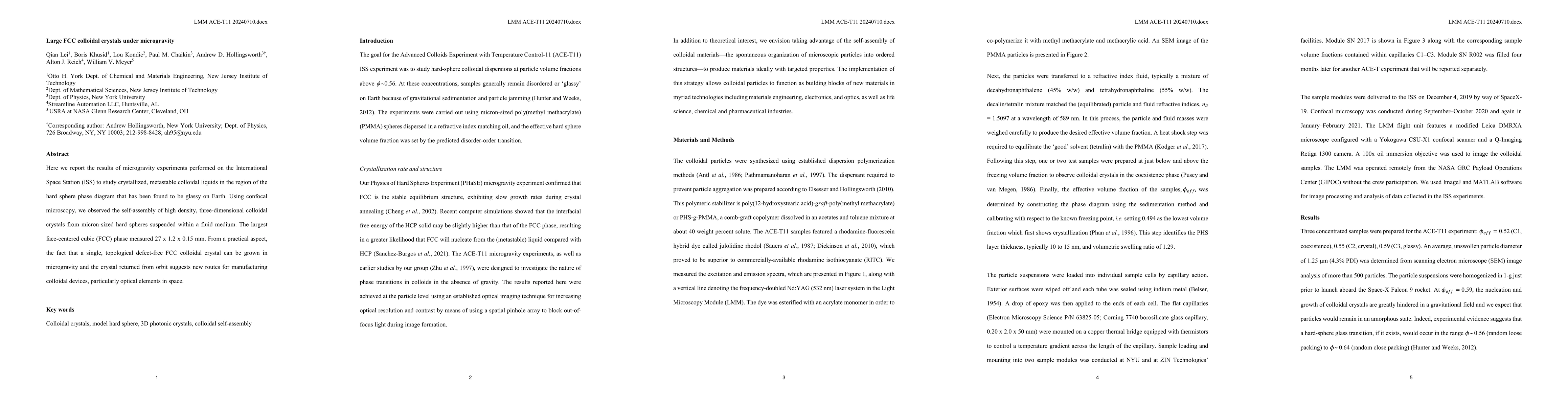 This research reports successful growth of large, defect-free face-centered cubic (FCC) colloidal crystals under microgravity conditions aboard the International Space Station, revealing self-assembly of micron-sized hard spheres. This achievement paves the way for advanced manufacturing of colloidal devices, especially optical elements, in space.