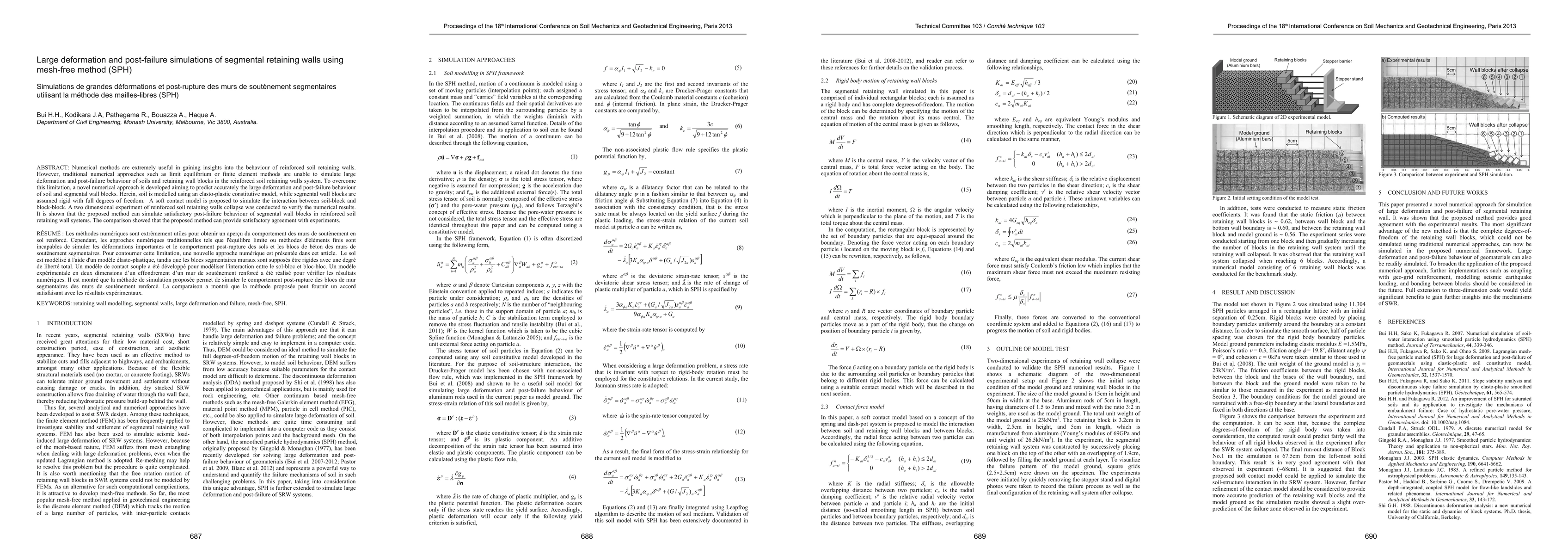 This paper develops a mesh-free Smoothed Particle Hydrodynamics (SPH) method to simulate large deformation and post-failure behaviour in reinforced soil retaining walls, showing accurate predictions compared to experimental results. The method models soil with an elasto-plastic model and uses a soft contact model for interactions.