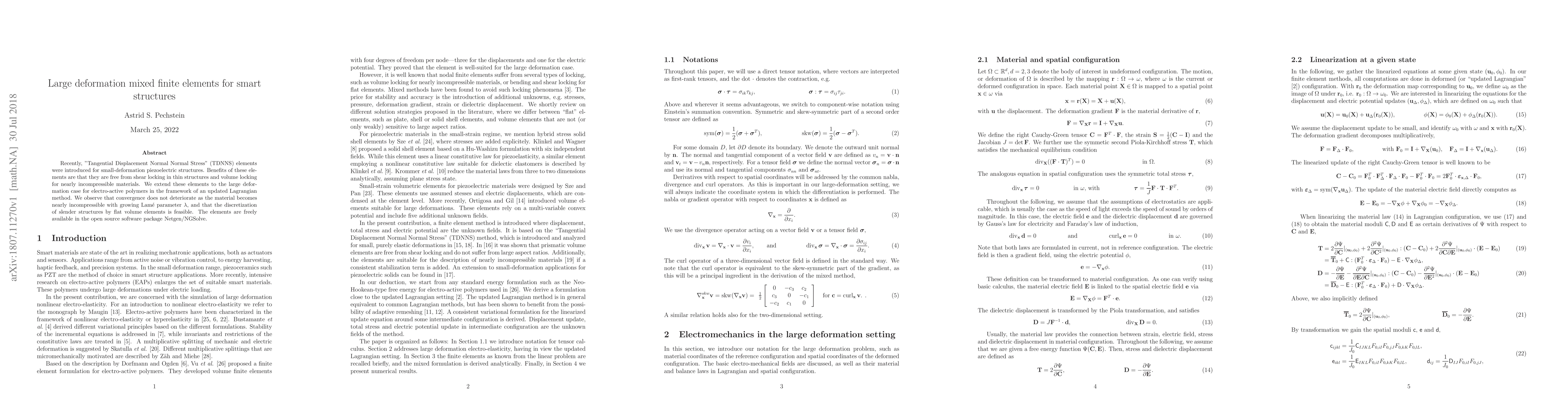 Recently, "Tangential Displacement Normal Normal Stress" (TDNNS) elements were introduced for small-deformation piezoelectric structures. Benefits of these ele- ments are that they are free from shear locking in thin structures and volume locking for nearly incompressible materials. We extend these elements to the large defor- mation case for electro-active polymers in the framework of an updated Lagrangian method. We observe that convergence does not deteriorate as the material becomes nearly incompressible with growing Lam\'e parameter $\lambda$, and that the discretization of slender structures by flat volume elements is feasible. The elements are freely available in the open source software package Netgen/NGSolve.