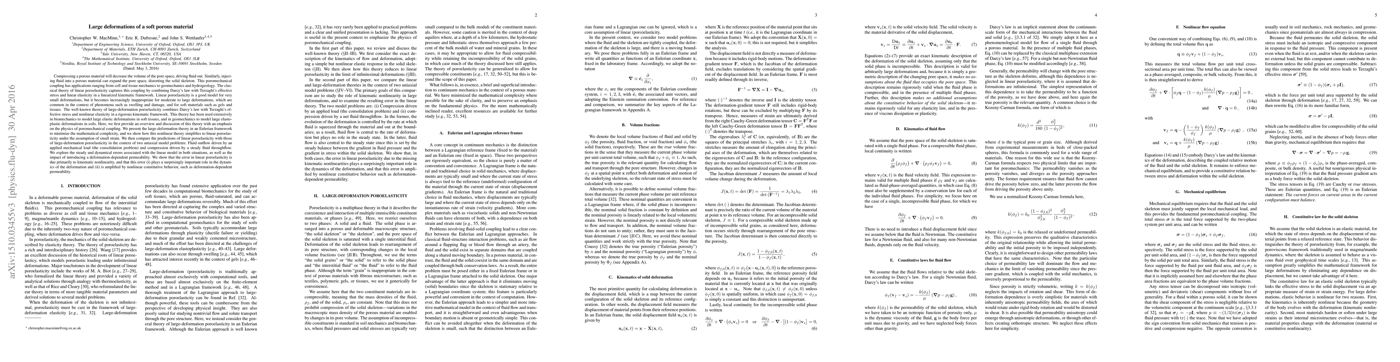This paper reviews the theory of large-deformation poroelasticity, emphasizing its application to soft porous materials like gels and tissues. It contrasts this theory with linear poroelasticity, demonstrating its superiority for modeling large deformations and comparing both models through uniaxial consolidation and compression problems.