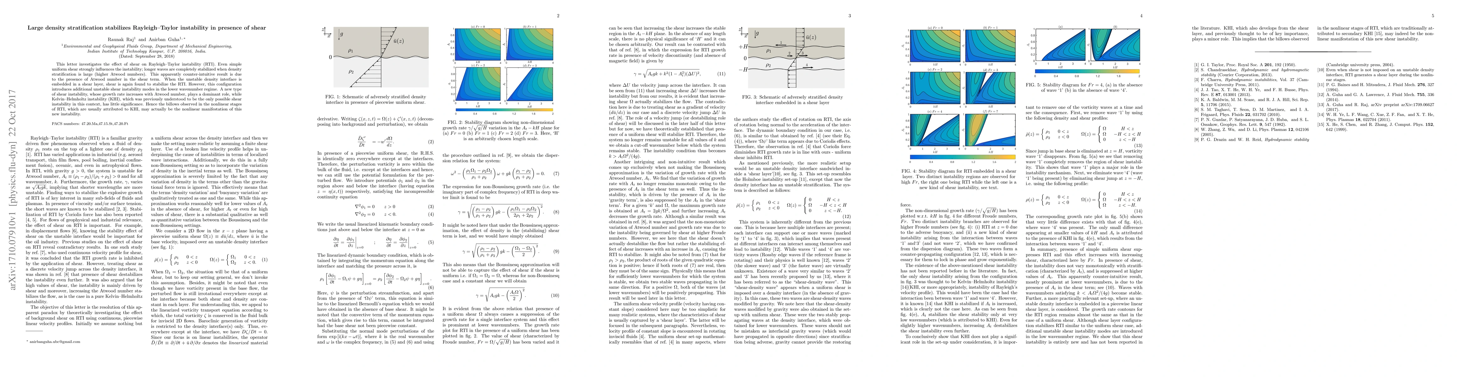 This study reveals that large density stratification can stabilize Rayleigh-Taylor instability under shear, contrary to expectations, due to the influence of the Atwood number in the shear term. A new shear instability mode emerges, overshadowing the previously significant Kelvin-Helmholtz instability.