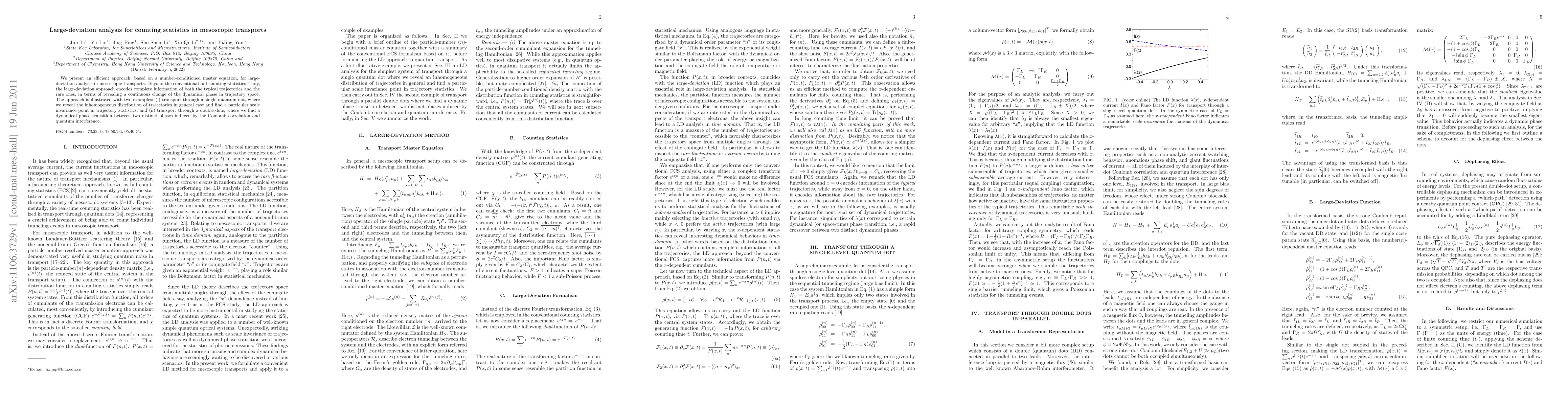 We present an efficient approach, based on a number-conditioned master equation, for large-deviation analysis in mesoscopic transports. Beyond the conventional full-counting-statistics study, the large-deviation approach encodes complete information of both the typical trajectories and the rare ones, in terms of revealing a continuous change of the dynamical phase in trajectory space. The approach is illustrated with two examples: (i) transport through a single quantum dot, where we reveal the inhomogeneous distribution of trajectories in general case and find a particular scale invariance point in trajectory statistics; and (ii) transport through a double dots, where we find a dynamical phase transition between two distinct phases induced by the Coulomb correlation and quantum interference.