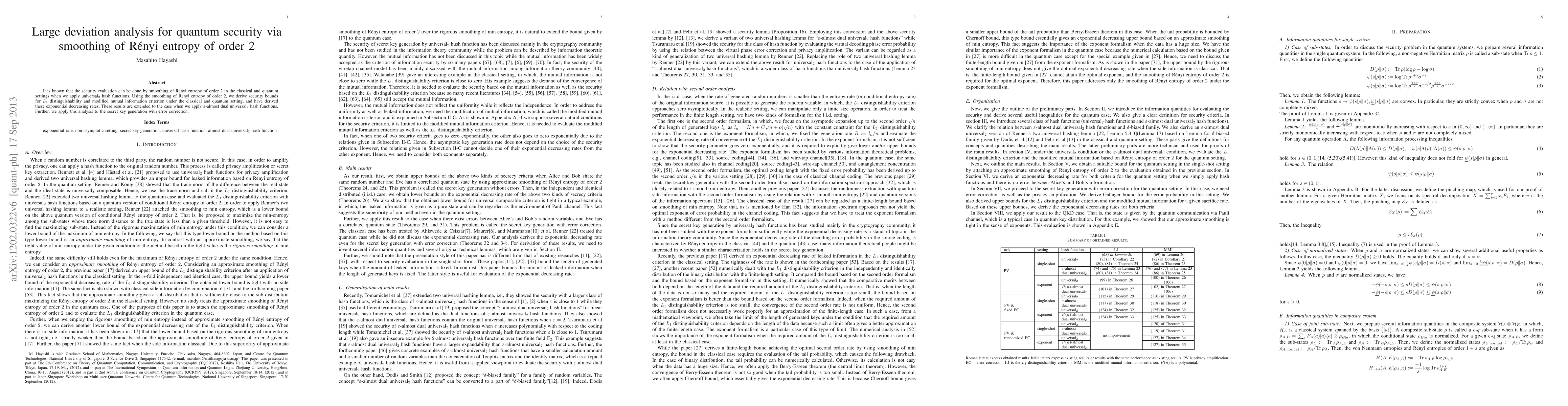 It is known that the security evaluation can be done by smoothing of R\'{e}nyi entropy of order 2 in the classical and quantum settings when we apply universal$_2$ hash functions. Using the smoothing of Renyi entropy of order 2, we derive security bounds for $L_1$ distinguishability and modified mutual information criterion under the classical and quantum setting, and have derived these exponential decreasing rates. These results are extended to the case when we apply $\varepsilon$-almost dual universal$_2$ hash functions. Further, we apply this analysis to the secret key generation with error correction.