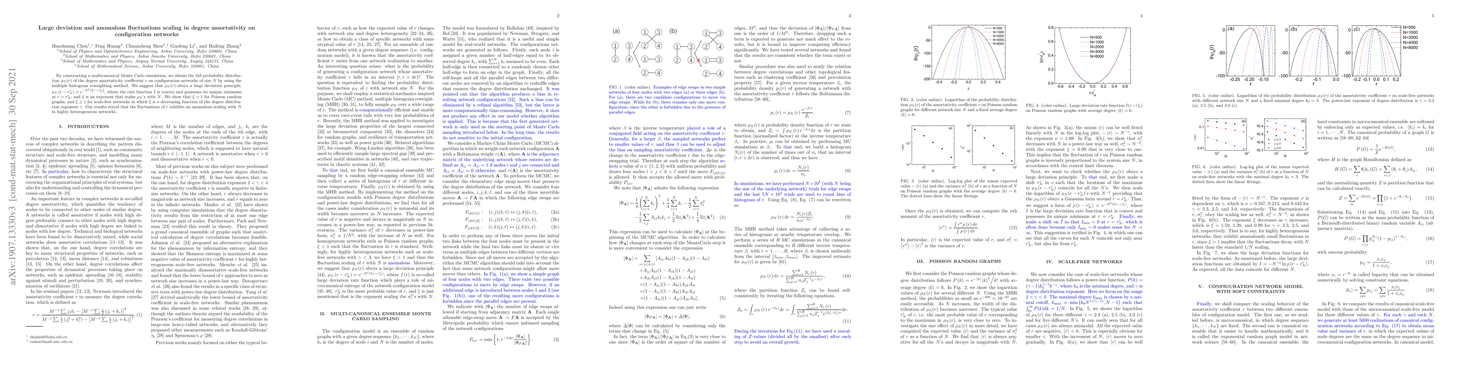 By constructing a multicanonical Monte Carlo simulation, we obtain the full probability distribution $\rho_N(r)$ of the degree assortativity coefficient $r$ on configuration networks of size $N$ by using the multiple histogram reweighting method. We suggest that $\rho_N(r)$ obeys a large deviation principle, $\rho_N \left(r-r_N^* \right) \asymp {e^{ - {N^\xi }I\left( {r- r_N^* } \right)}}$, where the rate function $I$ is convex and possesses its unique minimum at $r=r_N^*$, and $\xi$ is an exponent that scales $\rho_N$'s with $N$. We show that $\xi=1$ for Poisson random graphs, and $\xi\geq1$ for scale-free networks in which $\xi$ is a decreasing function of the degree distribution exponent $\gamma$. Our results reveal that the fluctuations of $r$ exhibits an anomalous scaling with $N$ in highly heterogeneous networks.