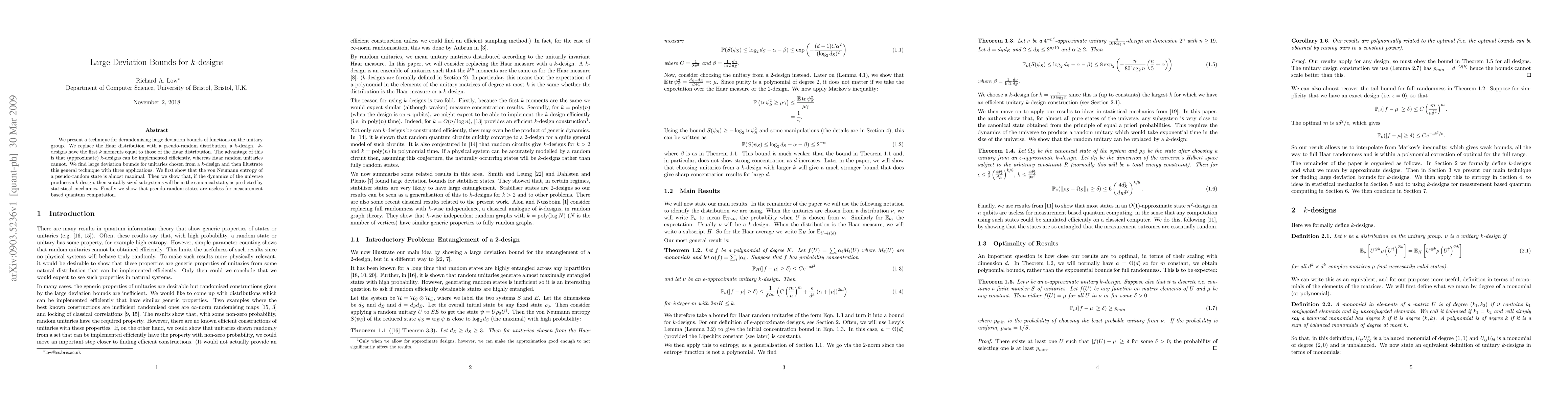 This paper develops a method for derandomizing large deviation bounds using k-designs, which approximate the Haar distribution and can be efficiently implemented. The authors demonstrate large deviation bounds for unitaries from k-designs and apply this technique to show maximal von Neumann entropy, canonical state predictions in statistical mechanics, and the inefficacy of pseudo-random states for quantum computation.