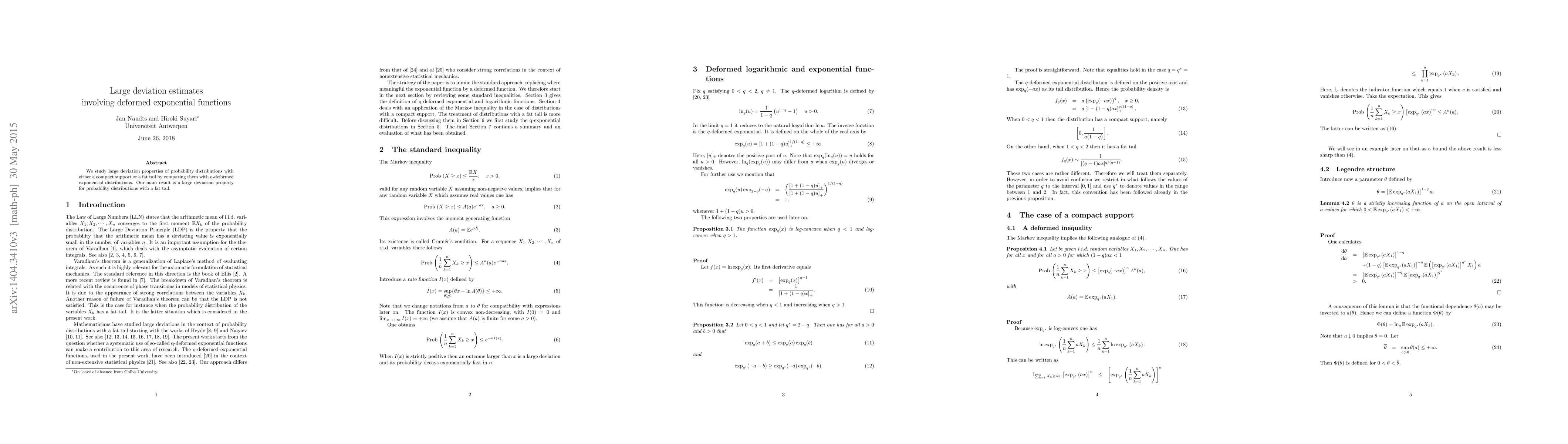 We study large deviation properties of probability distributions with either a compact support or a fat tail by comparing them with q-deformed exponential distributions. Our main result is a large deviation property for probability distributions with a fat tail.
