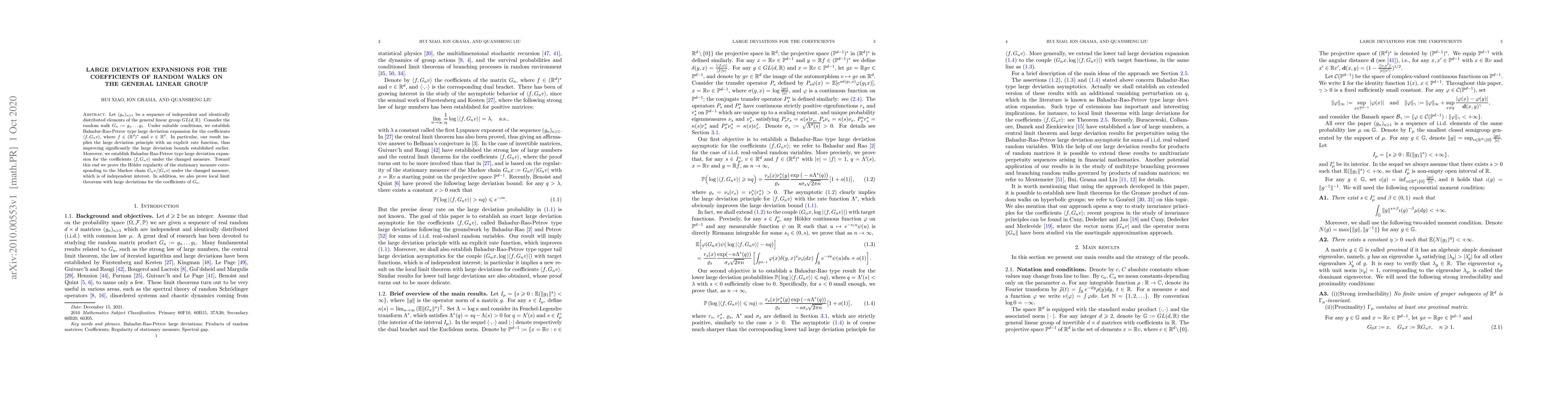 This paper establishes Bahadur-Rao-Petrov type large deviation expansions for coefficients of random walks on the general linear group, improving previous large deviation bounds with an explicit rate function. It also proves H\"older regularity of the stationary measure under a changed measure and local limit theorems with large deviations.