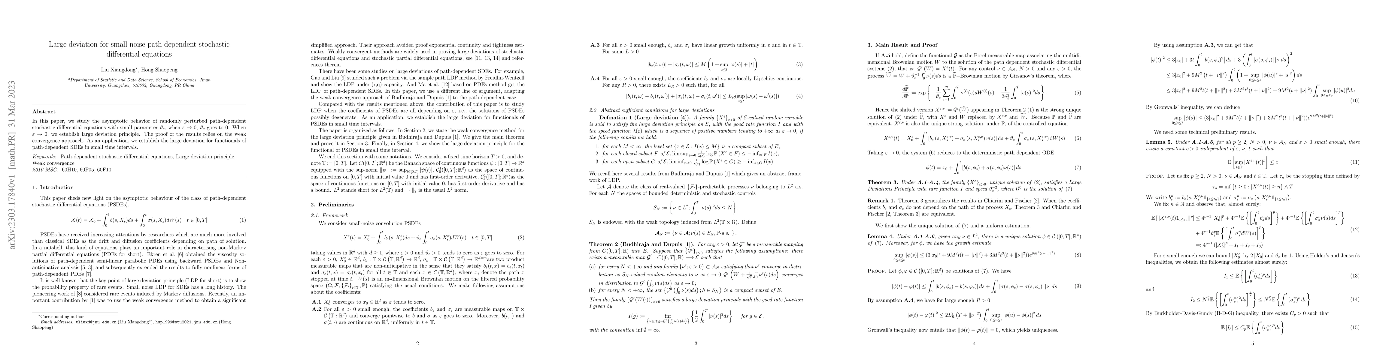 This paper investigates the asymptotic behavior of small noise perturbations in path-dependent stochastic differential equations, establishing a large deviation principle as the noise parameter approaches zero. The results are proven using weak convergence methods, and an application to functionals of these SDEs in short time intervals is provided.
