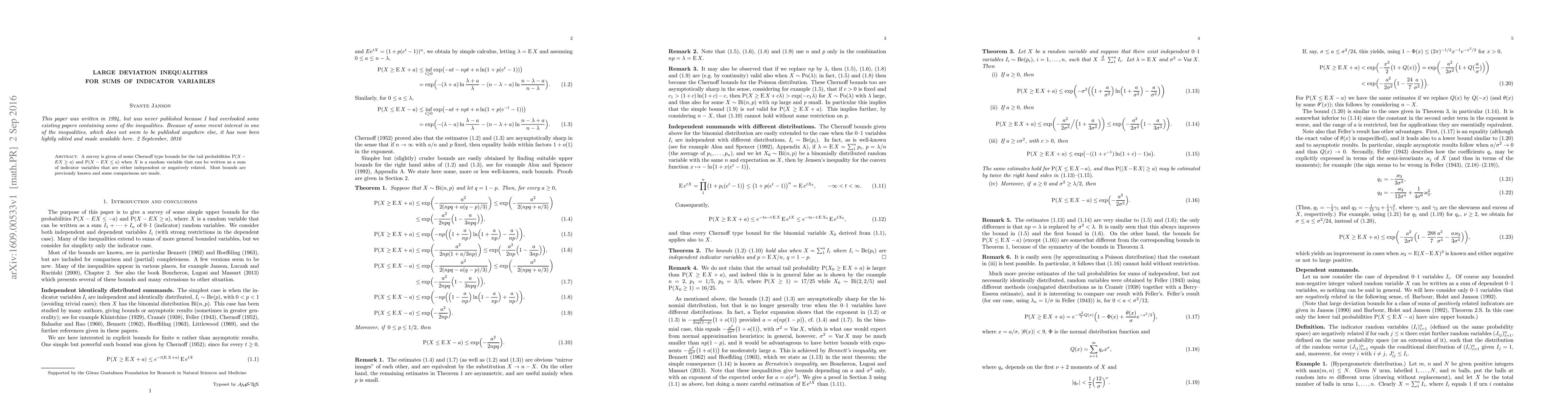 A survey is given of some Chernoff type bounds for the tail probabilities P(X-EX > a) and P(X-EX < a) when X is a random variable that can be written as a sum of indicator variables that are either independent or negatively related. Most bounds are previously known and some comparisons are made. This paper was written in 1994, but was never published because I had overlooked some existing papers containing some of the inequalities. Because of some recent interest in one of the inequalities, which does not seem to be published anywhere else, it has now been lightly edited and made available here.